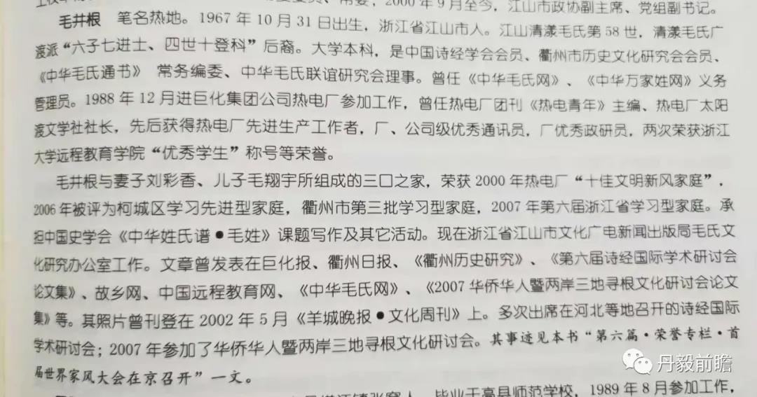 最后值得再絮叨几句的是,毛家之人的名字凡与水沾边的人,也似乎人生精彩。陪我瞻游的清漾毛氏第58世孙毛井根先生,即是一例。“井根”者,井中存水之基础也——于是,井根的人生就显出精彩了:中国诗经学会会员、衢州市历史文化研究会会员、《中华毛氏通书》常务编委……下面的照片文字是《中华毛氏风采录》的专文介绍,和其上“电视”的精彩照片——“沾水”之人也牛㐅也。!