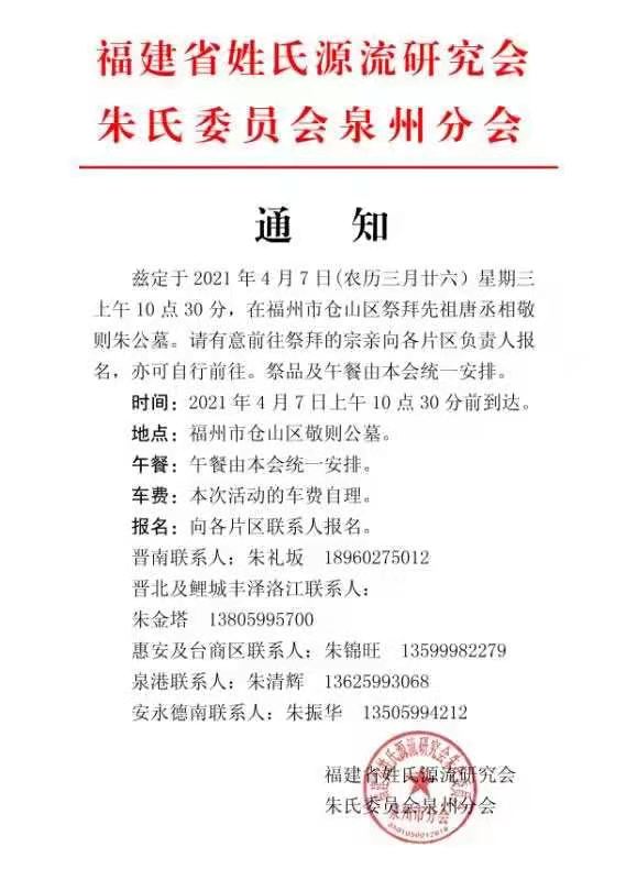 兹定于2021年4月7日(农历三月廿六) 星期三上午10点30分,在福州市仓山区祭拜先祖唐丞相敬则朱公墓。请有意前往祭拜的宗亲向各片区负责人报名,亦可自行前往。祭品及午餐由本会统安排。