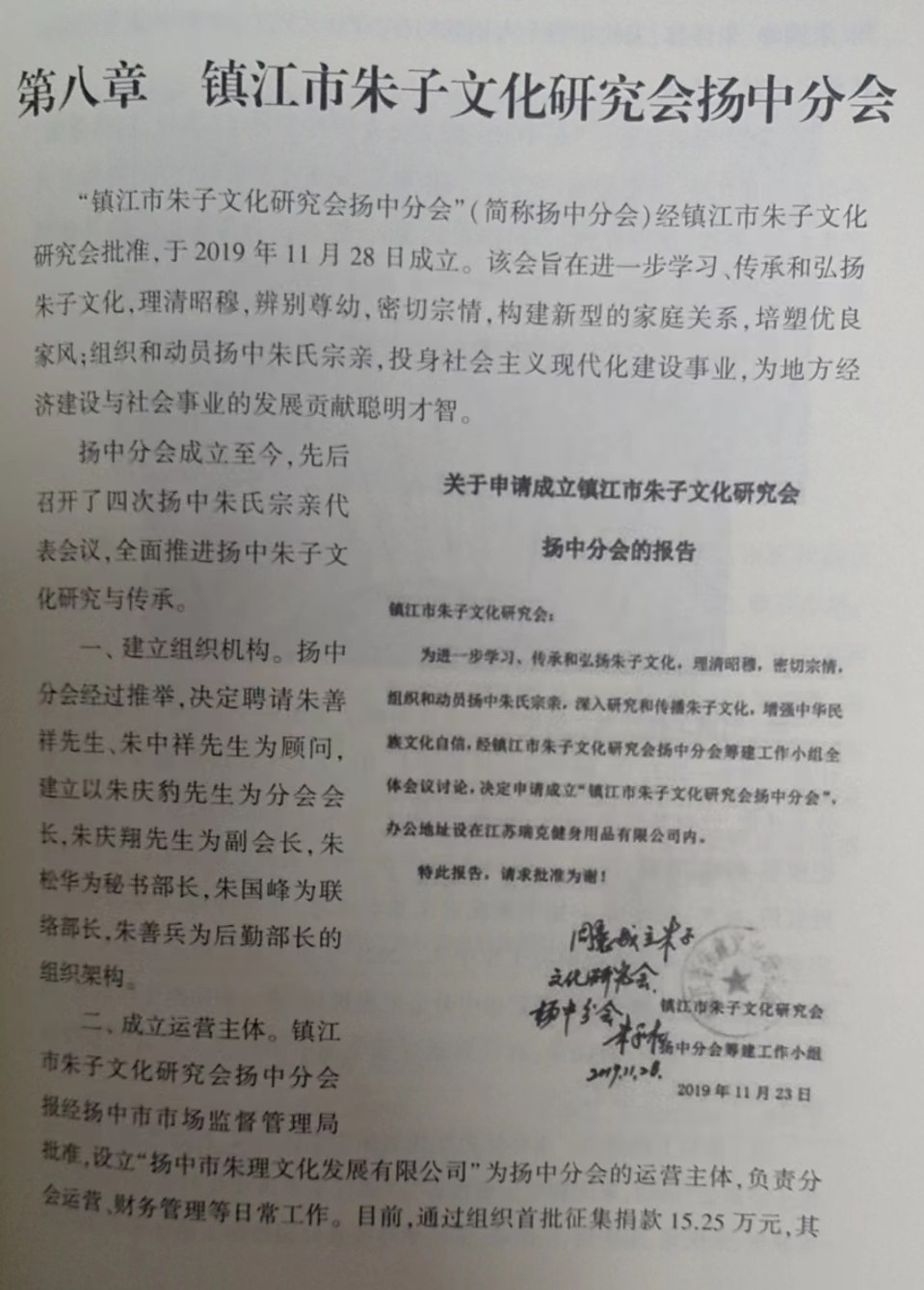 “镇江市朱子文化研究会扬中分会”(简称扬中分会)经镇江市朱子文化研究会批准,于2019年11月28日成立。该会旨在进一步学习、传承和弘扬朱子文化,理清昭穆,辨别尊幼,密切宗情,构建新型的家庭关系,培塑优良家风;组织和动员扬中朱氏宗亲,投身社会主义现代化建设事业,为地方经济建设与社会事业的发展贡献聪明才智。