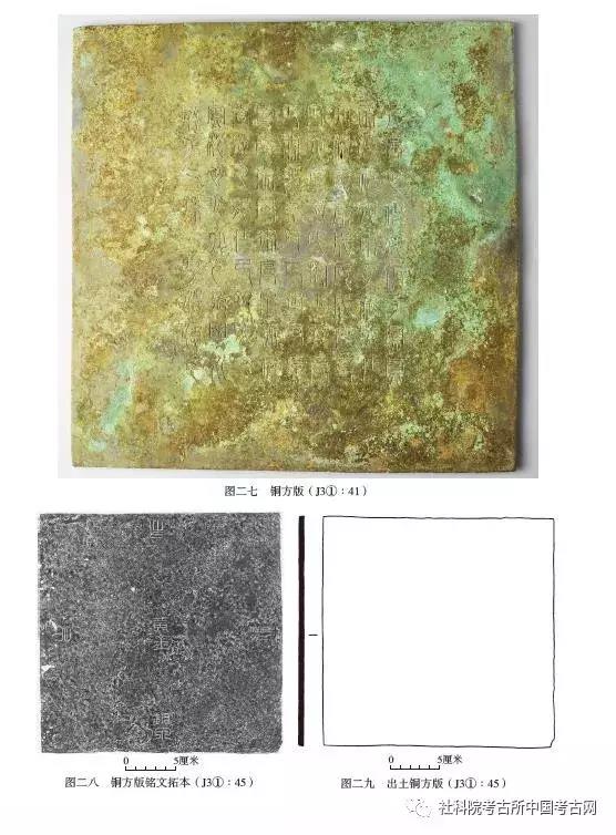 方版3件。平面近方形,正面略大于反面,断面略呈倒梯形。上、下及左侧边缘经打磨修整,右侧边缘未经打磨,略显粗糙。J3①∶40,保存完整,浅褐色。正面平整光滑,反面锈蚀较严重。正面中部有铭文9行,每行9字,含两个重文,共81字。铭文内容与J3①∶49铜权相同,只是行款不同(图二三)。正面边长25.5~25.9、反面边长25.4~25.7、厚0.48~0.62厘米(图二四,1;图二五)。J3①∶41,保存完整,深绿色。正面平整光滑,反面锈蚀较严重。右侧边缘凹凸不平。正面中部有铭文9行,每行9字,含两个重文,共81字。铭文内容与J3①∶49铜权相同,只是行款不同(图二六)。正面边长25.7~26.1、反面边长25.6~25.9、厚0.49~0.58厘米(图二四,2;图二七)。J3①∶45,保存较完整,仅右下角略残,青绿色。表面锈蚀,正面及反面均有缩孔,上、下及左侧边缘经打磨修整,右侧边缘未经打磨,略显粗糙。正面中心及四边正中有铭文7字,中间为“黄金”,上为“布”,下为“铜泉”,左为“帛”,右为“絮”(图二八)。正面边长23.6~23.9、反面边长23.5~23.7、厚0.45~0.54厘米(图二九;图三〇)。