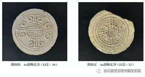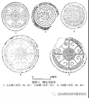 Ab型:当面略内凹。J3①∶4,夹砂灰陶。边缘残。当心饰“十”字纹,“十”字纹四角饰矩形纹,外围以单线“十”字凸弦纹为界饰弦纹和卷云纹,侧面饰中绳纹。背面有线切割痕迹。复原直径16厘米(图四二,7)。J3①∶19,夹砂灰陶。边缘残。当心饰小方格纹,外围以双线“米”字形凸弦纹为界饰弦纹和卷云纹。直径14.8厘米(图四二,6)。J3①∶22,夹砂青灰陶。边缘微残,当面略变形,不甚平整。当心饰凸点纹,外围以双线“十”字形凸弦纹为界饰弦纹和卷云纹,反面有修整时形成的按窝和浅槽。直径14.9厘米(图四二,8;图四三,3)。J3①∶31,夹砂灰陶。边缘略残。当心饰小方格纹,边缘及中心饰成对和单独乳丁,外围以双线“米”字形凸弦纹为界饰弦纹和卷云纹,反面边缘有线切割痕迹。直径14.6厘米(图四二,9)。B型:较大,当面内凹。J3①∶20,夹砂黄褐陶。当心饰小方格纹,外围以双线“十”字形凸弦纹为界饰弦纹和卷云纹。侧壁残存修整痕迹。直径21.2厘米(图四二,10;图四三,4;图四七)。J3①∶26,夹砂灰陶。边缘残。当心饰小方格纹,外围以双线“十”字形凸弦纹为界饰弦纹和卷云纹。内壁边缘局部残存修整时形成的细密痕迹。直径21厘米(图四二,11;图四三,5)。