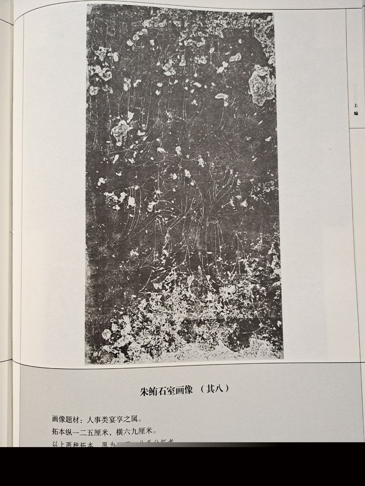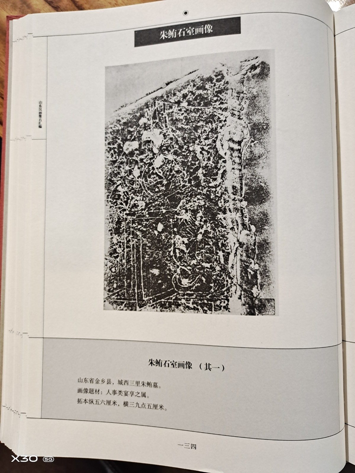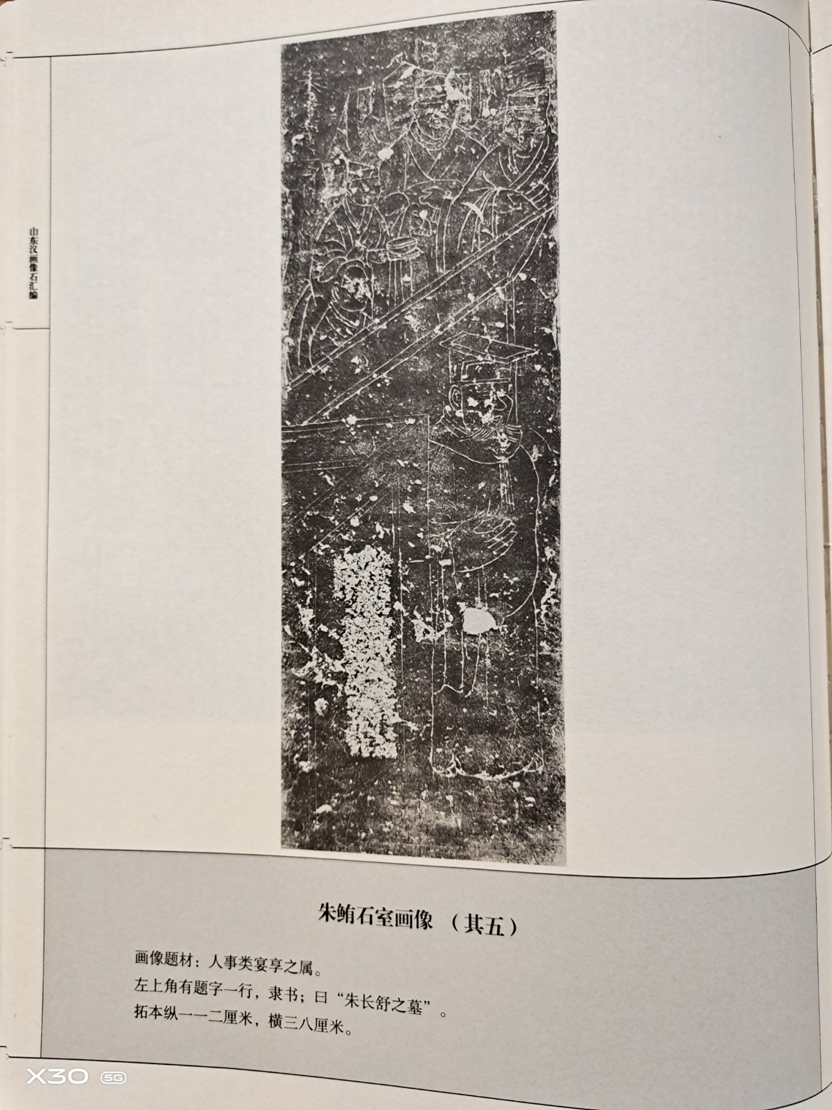 《山左金石志》载:"朱鲔墓石室画像,分为25幅;上层12幅,高一尺五寸,下层13幅,高三尺五寸。唯横广尺寸不等。每幅有帷幕列屏及杯盘樽勺,皆燕飨宾客之事。凡男子皆有端冕者,有纱帽者,有如僧帽二层者,有如巾子双梁者,有裹帻向前如飘缨者,有上仰盖形者,有下园上锐者,种类不一,衣领及袖有褶。女像首有冠髻,髻上饰钗,股间有缀珠者,唯一书上有八分书,题"朱长舒之墓"五字,天斜不工,又下有八分书四行"。[1]