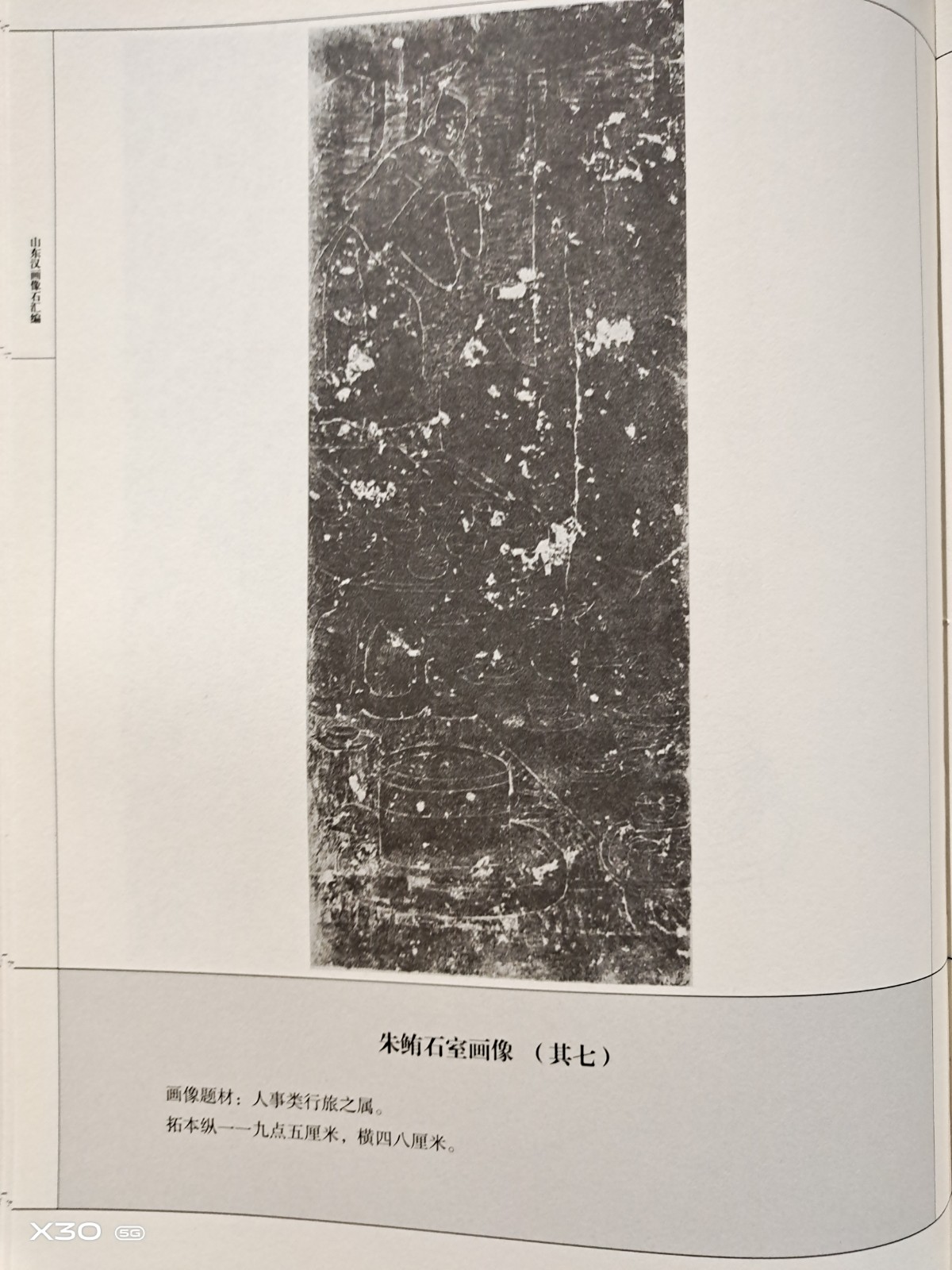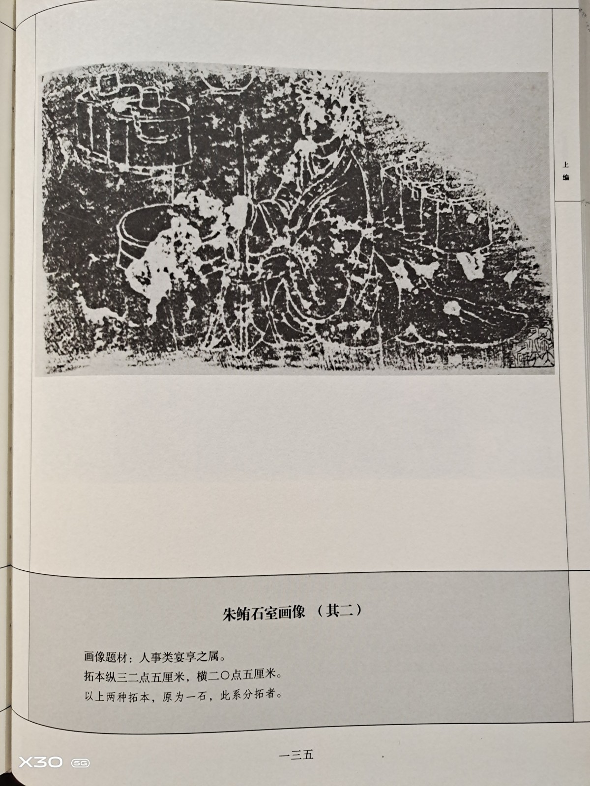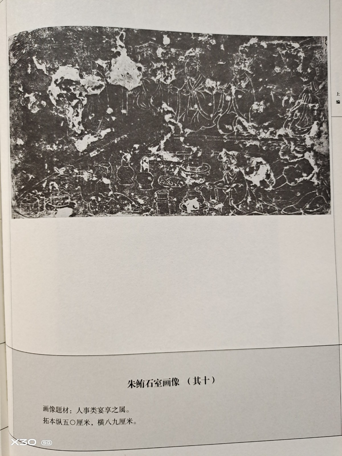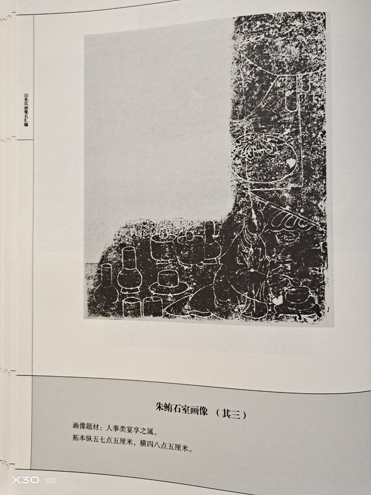 《山左金石志》载:"朱鲔墓石室画像,分为25幅;上层12幅,高一尺五寸,下层13幅,高三尺五寸。唯横广尺寸不等。每幅有帷幕列屏及杯盘樽勺,皆燕飨宾客之事。凡男子皆有端冕者,有纱帽者,有如僧帽二层者,有如巾子双梁者,有裹帻向前如飘缨者,有上仰盖形者,有下园上锐者,种类不一,衣领及袖有褶。女像首有冠髻,髻上饰钗,股间有缀珠者,唯一书上有八分书,题"朱长舒之墓"五字,天斜不工,又下有八分书四行"。[1]