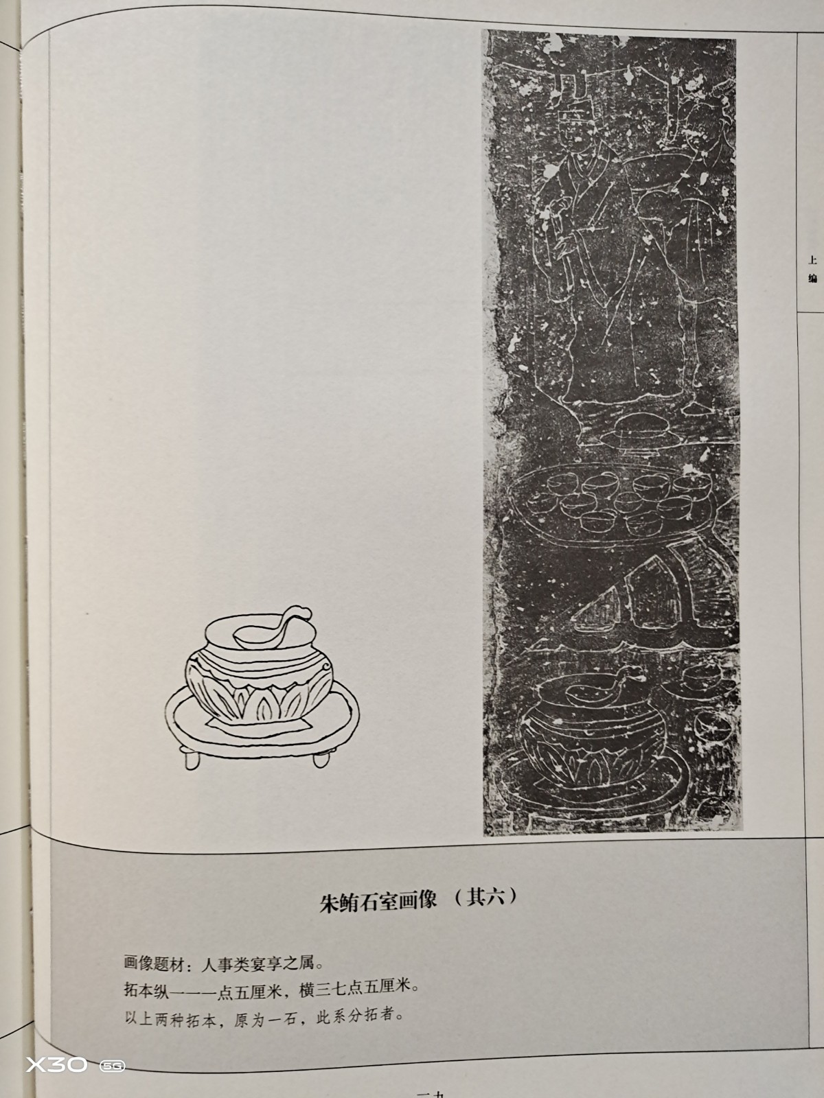 《梦溪笔谈》又载:"石壁刻人物、祭器、乐架之类"。"人之衣冠多品,有如今之幞头者,巾额皆方,悉如今制,但无脚耳。妇人亦有如今之垂肩冠者,如近年所服角冠,两翼包面,下垂及肩,略无小异。人情不相远,千馀年前,冠服已尝如此,其祭器亦有类今之食器者。"[3]