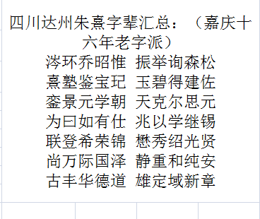 四川达州朱熹字辈汇总:(嘉庆十六年老字派) 涔环乔昭惟 振举询森松 熹塾鉴宝玘 玉碧得建佐 銮景元学朝 天克尔思元 为曰如有仕 兆以学继锡 联登希荣锦 懋秀绍光贤 尚万际国泽 静重和纯安 古丰华德道 雄定域新章 殷切期盼有相同或近似以上字派的宗亲及时与我联系 朱白龙13534568790