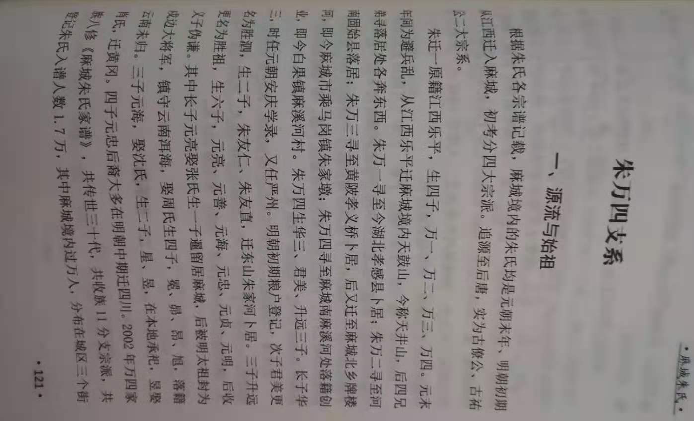 湖北麻城朱万四支系 根据朱氏各宗谱记载,湖北麻城境内的朱氏均是元朝末年、明朝初期从江西迁入麻城,初考分四大宗派。追源至后唐,实为古僚公、古祐公二大宗系。