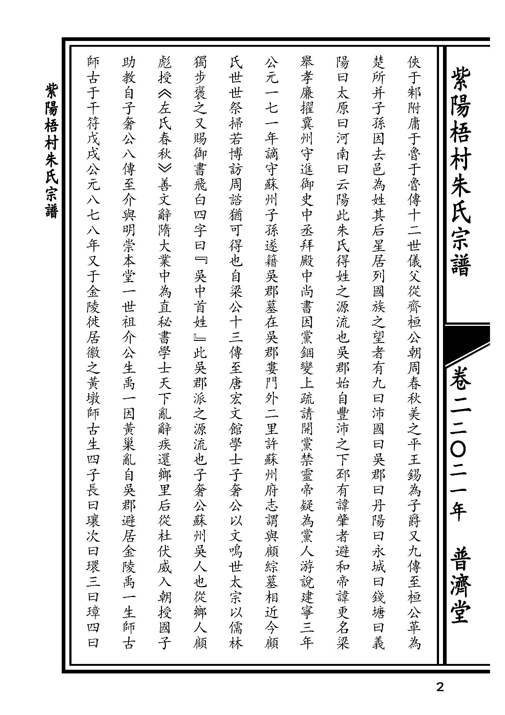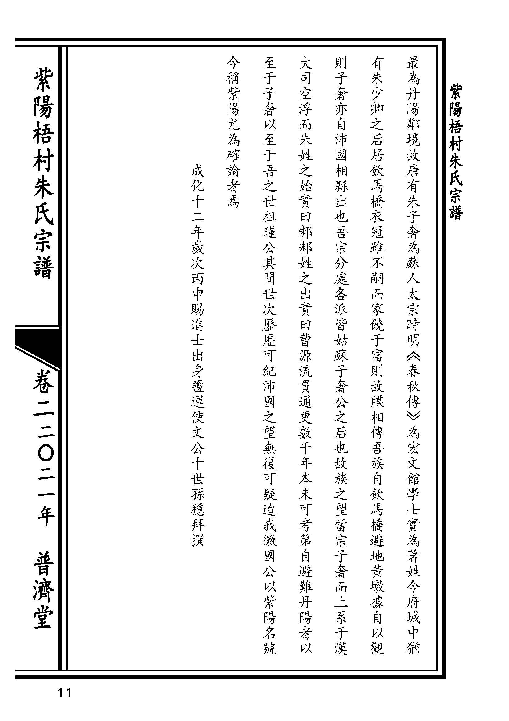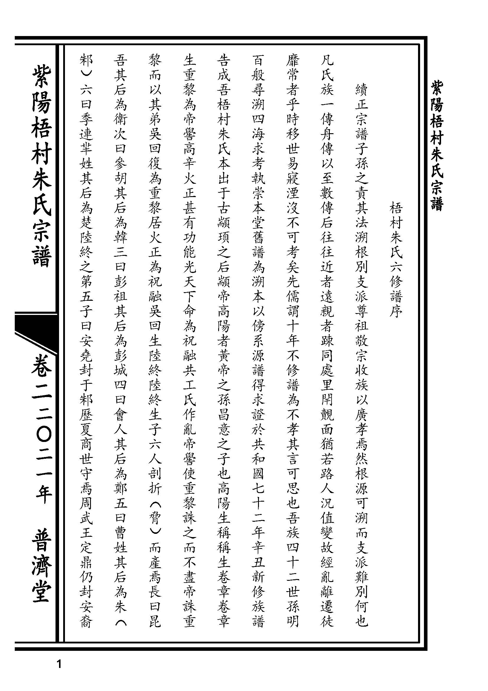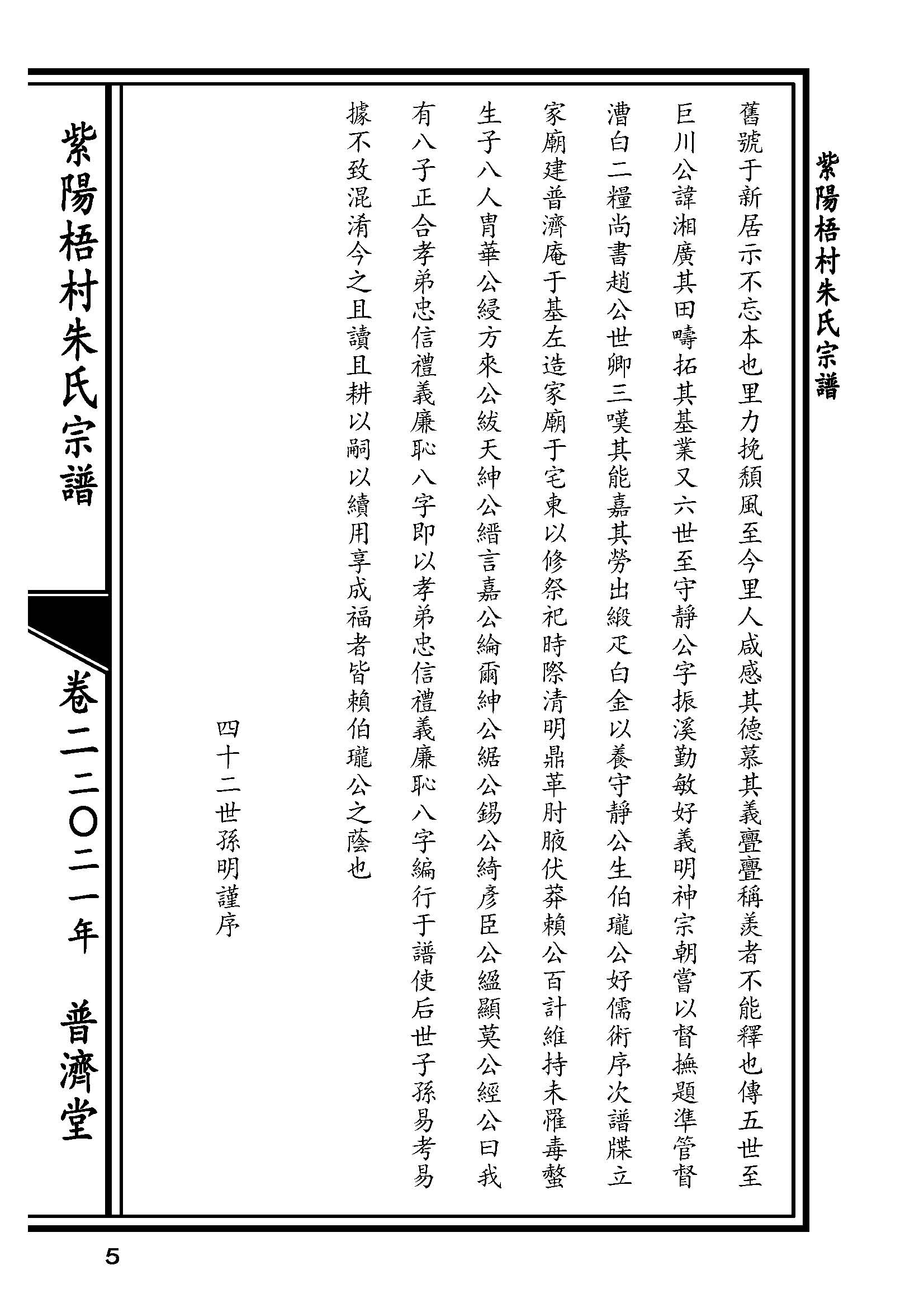 续正宗谱子孙之责其法溯根别支派尊祖敬宗收族以广孝焉然根源可溯而支派难别何也凡氏族一传舟传以至数傳后往往近者远亲者䟱同处里閈覿面猶若路人况值变故经乱离遷徒靡常者乎时移世易寝湮没不可考矣先儒谓十年不修谱为不孝其言可思也吾族四十二世孙明百般寻溯四海求考執崇本堂旧谱为溯本以傍系源谱得求证於共和国七十二年辛丑新修族谱告成吾梧村朱氏本出于古颛顼之后颛帝高阳者黄帝之孙昌意之子也高阳生称称生卷章卷章生重黎为帝喾高辛火正甚有功能光天下命为祝融共工氏作乱帝喾使重黎诛之而不尽帝诛重黎而以其弟吴回复为重黎居火正为祝融吴回生陆终陆终生子六人剖折(胁)而产焉长曰昆吾其后为卫次曰参胡其后为韩三曰彭祖其后为彭城四曰会人其后为郑五曰曹姓其后为朱(邾)六曰季连芈姓其后为楚陆终之第五子曰安尧封于邾历夏商世守焉周武王定鼎仍封安裔侠于邾附庸于鲁于鲁传十二世仪父从齐桓公朝周春秋美之平王锡为子爵又九传至桓公革为楚所并子孙因去邑为姓其后星居列国族之望者有九曰沛国曰吴郡曰丹阳曰永城曰钱塘曰义阳曰太原曰河南曰云阳此朱氏得姓之源流也吴郡始自丰沛之下邳有讳肇者避和帝讳更名梁举孝廉擢冀州守进御史中丞拜殿中尚书因党锢变上疏请开党禁灵帝疑为党人游说建宁三年公元一七一年谪守苏州子孙遂籍吴郡墓在吴郡娄门外二里许苏州府志谓与顾综墓相近今顾氏世世祭扫若博访周谘犹可得也自梁公十三传至唐宏文馆学士子奢公以文鸣世太宗以儒林独步褒之又赐御书飞白四字曰“吴中首姓”此吴郡派之源流也子奢公苏州吴人也从乡人顾彪授《左氏春秋》善文辞隋大业中为直秘书学士天下乱辞疾还乡里后从杜伏威入朝授国子助教自子奢公八传至介与明崇本堂一世祖介公生禹一因黄巢乱自吴郡避居金陵禹一生师古师古于干符戊戌公元八七八年又于金陵徙居徽之黄墩师古生四子长曰瓖次曰环三曰璋四曰瑾吾族四世祖环公古僚公讳瓌字舜臣行廿一师古公次子唐天佑元年公元九○四年奉歙县刺史陶雅偏将之命领兵三千镇戍婺源邑包括新县浮梁德兴祈门等四县唐天佑三年公元九〇六年十月由歙州刺史升任宣歙池平苏杭饶信八州观察使民赖以安遂从黄墩迁居婺源官制茶院使世称茶院府君谥文武追封为忠武侯越九世而文公诞生此徽州派之源流也十二世熹公字符晦又字仲晦号晦庵晚称晦翁谥文世称朱文公祖籍徽州府婺源县今江西省婺源出生于南剑州尤溪今属福建省尤溪县宋朝著名的理学家思想家哲学家教育家诗人闽学派的代表人物儒学集大成者世尊称为朱子朱熹是唯一非孔子亲传弟子而享祀孔庙位列大成殿十二哲者中受儒教祭祀①朱熹是“二程”程颢程颐的三传弟子李侗的学生与二程合称“程朱学派”朱熹的理学思想对元明清三朝影响很大成为三朝的官方哲学是中国教育史上继孔子后的又一人文公十九岁考中进士曾任江西南康福建漳州知府浙东巡抚做官清正有为振举书院建设官拜焕章阁侍制兼侍讲为宋宁宗皇帝讲学文公始卜宅建阳之考亭生三子长曰受之公讳塾次曰文之公讳埜三曰敬之公讳在埜公四传至伯通公因元兵进逼避地梁溪今迁砂山遂为砂山始祖至于我分支之始祖敬之公派本文公行为季子官工部侍郎歴赠至建阳郡开国候银青光禄大夫食邑三千户生四子曰铉曰铸曰铅曰钰铉公字子玉又字子鼎官两浙运判因宋季道梗遂寓杭城贡院桥生二子曰湸公濂公湸公随父还闽濂公则自杭而复归于徽之歙邑者也时已宋亡矣生一子曰公实公讳栝行千三号遇春元代名儒公实公生子五子曰日升公日明公日日兴公曰日新公曰日增公日明公行再字七秀因于元世祖至元间官至站马迁杭城一子曰福二公福二公者我梧村迁居之始祖也字福田讳留耕幼而颖悟长而端严仁义秉其心孝友端其行值明洪武三年诏天下户口凋残之地准以三丁抽一之法徒贤良方正之士堪为风俗表率者以实之并敕部给以宁家二贴一存本宗一随迁所两为炳据公于是遵旨领贴迁藉江阴卜居祝塘之北歙之故里本名梧村乃施旧号于新居示不忘本也里力挽颓风至今里人咸感其德慕其义亹亹称羡者不能释也传五世至巨川公讳湘广其田畴拓其基业又六世至守静公字振溪勤敏好义明神宗朝尝以督抚题准管督漕白二粮尚书赵公世卿三叹其能嘉其劳出缎疋白金以养守静公生伯珑公好儒术序次谱牒立家庙建普济庵于基左造家庙于宅东以修祭祀时际清明鼎革肘腋伏莽赖公百计维持未罹毒螫生子八人胄华公綅方来公绂天绅公缙言嘉公纶尔绅公䋧公锡公绮彦臣公䋼显莫公经公曰我有八子正合孝弟忠信礼义廉恥八字即以孝弟忠信礼义廉恥八字编行于谱使后世子孙易考易据不致混淆今之且读且耕以嗣以续用享成福者皆赖伯珑公之荫也