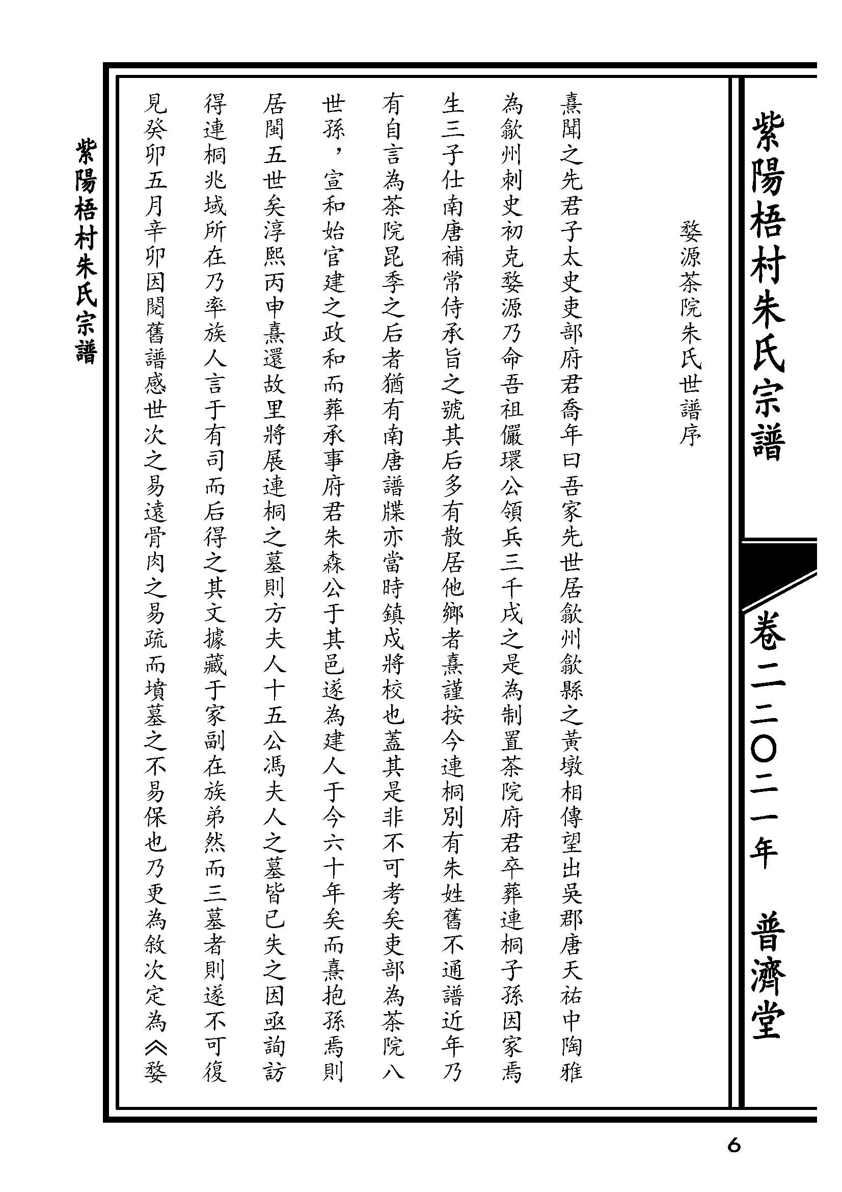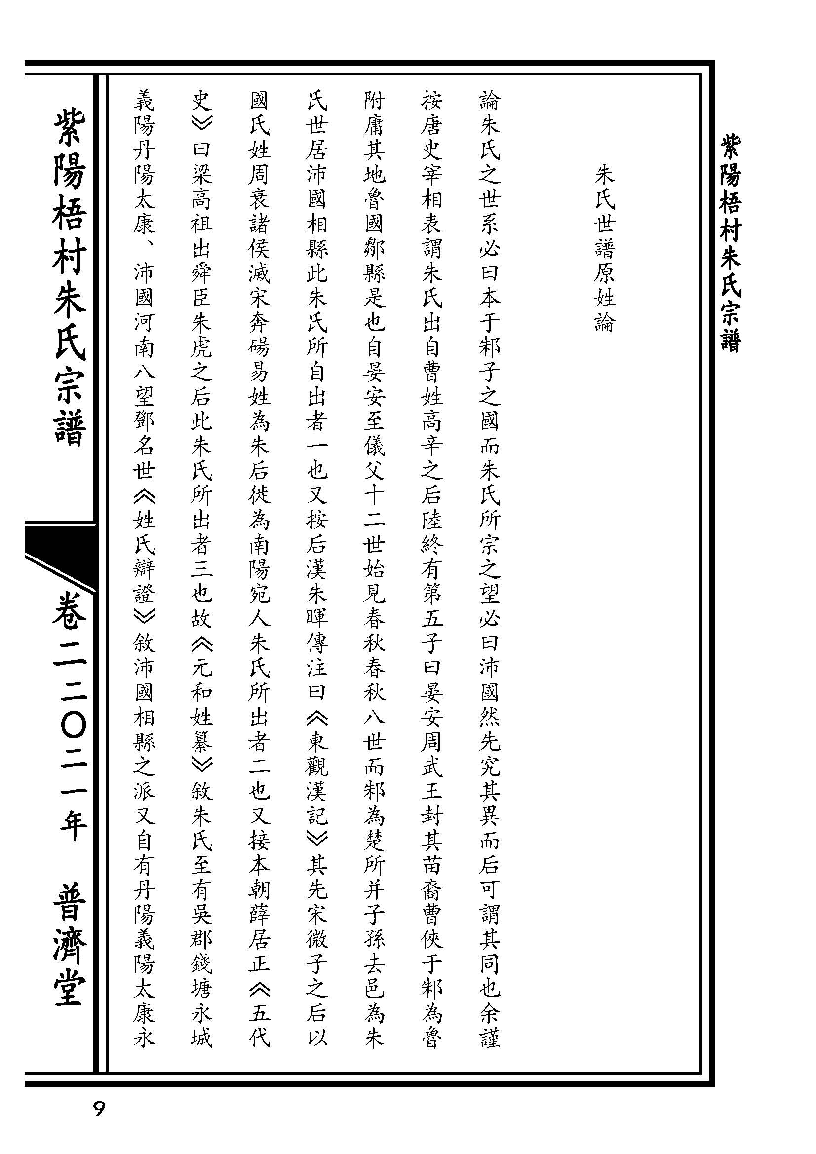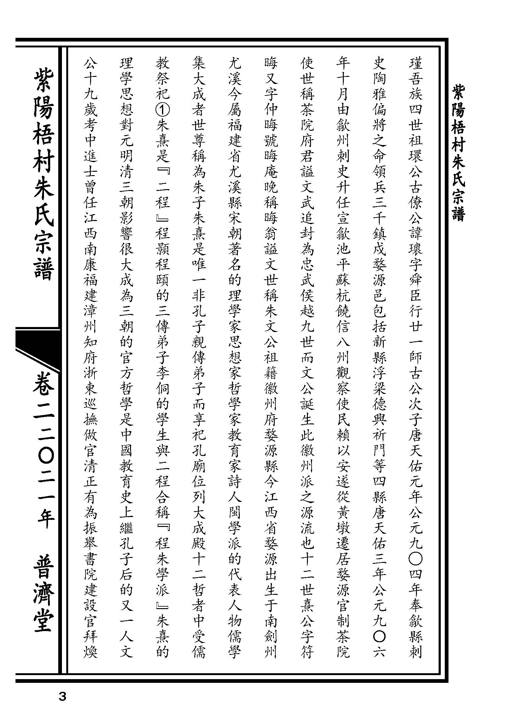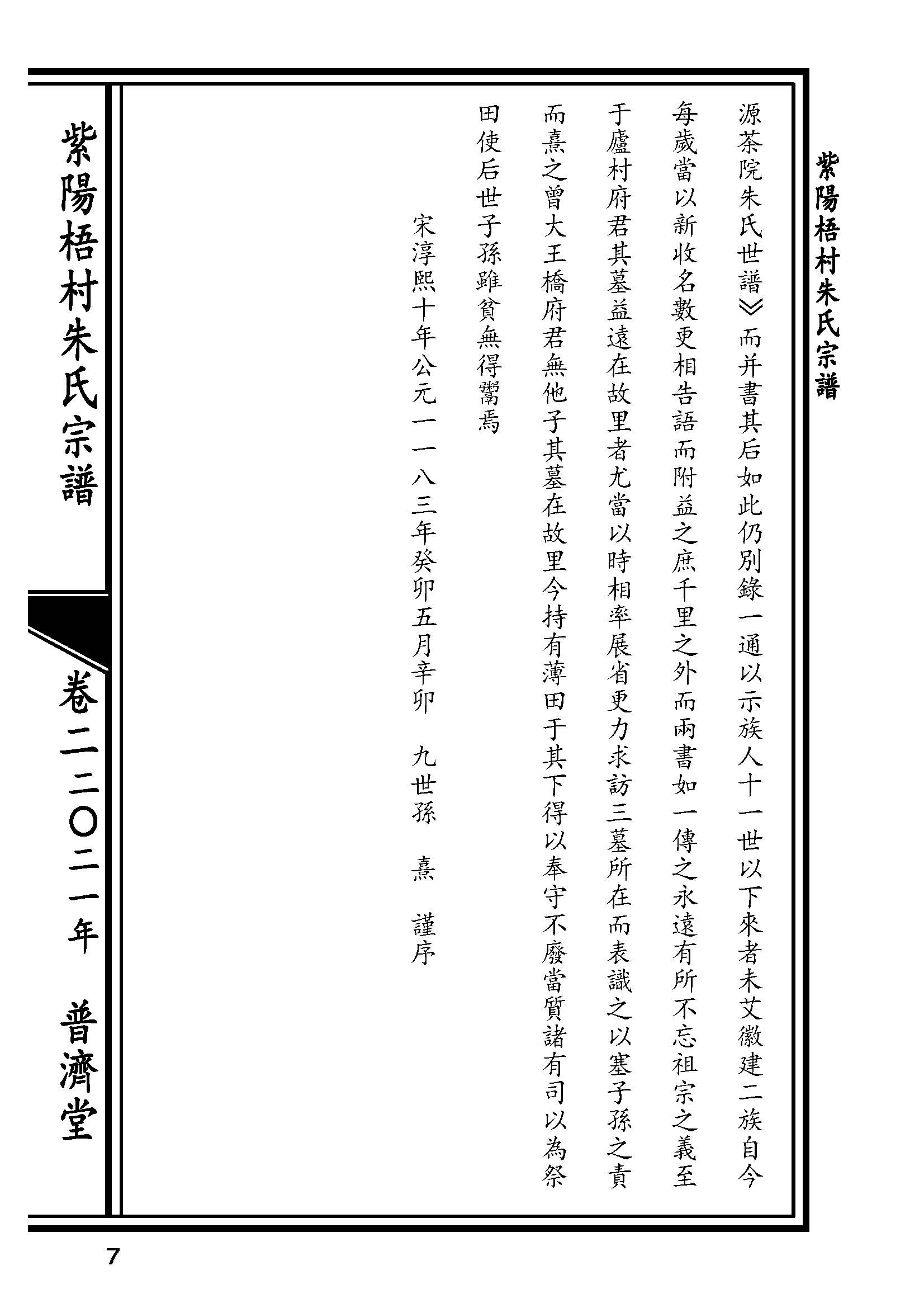 续正宗谱子孙之责其法溯根别支派尊祖敬宗收族以广孝焉然根源可溯而支派难别何也凡氏族一传舟传以至数傳后往往近者远亲者䟱同处里閈覿面猶若路人况值变故经乱离遷徒靡常者乎时移世易寝湮没不可考矣先儒谓十年不修谱为不孝其言可思也吾族四十二世孙明百般寻溯四海求考執崇本堂旧谱为溯本以傍系源谱得求证於共和国七十二年辛丑新修族谱告成吾梧村朱氏本出于古颛顼之后颛帝高阳者黄帝之孙昌意之子也高阳生称称生卷章卷章生重黎为帝喾高辛火正甚有功能光天下命为祝融共工氏作乱帝喾使重黎诛之而不尽帝诛重黎而以其弟吴回复为重黎居火正为祝融吴回生陆终陆终生子六人剖折(胁)而产焉长曰昆吾其后为卫次曰参胡其后为韩三曰彭祖其后为彭城四曰会人其后为郑五曰曹姓其后为朱(邾)六曰季连芈姓其后为楚陆终之第五子曰安尧封于邾历夏商世守焉周武王定鼎仍封安裔侠于邾附庸于鲁于鲁传十二世仪父从齐桓公朝周春秋美之平王锡为子爵又九传至桓公革为楚所并子孙因去邑为姓其后星居列国族之望者有九曰沛国曰吴郡曰丹阳曰永城曰钱塘曰义阳曰太原曰河南曰云阳此朱氏得姓之源流也吴郡始自丰沛之下邳有讳肇者避和帝讳更名梁举孝廉擢冀州守进御史中丞拜殿中尚书因党锢变上疏请开党禁灵帝疑为党人游说建宁三年公元一七一年谪守苏州子孙遂籍吴郡墓在吴郡娄门外二里许苏州府志谓与顾综墓相近今顾氏世世祭扫若博访周谘犹可得也自梁公十三传至唐宏文馆学士子奢公以文鸣世太宗以儒林独步褒之又赐御书飞白四字曰“吴中首姓”此吴郡派之源流也子奢公苏州吴人也从乡人顾彪授《左氏春秋》善文辞隋大业中为直秘书学士天下乱辞疾还乡里后从杜伏威入朝授国子助教自子奢公八传至介与明崇本堂一世祖介公生禹一因黄巢乱自吴郡避居金陵禹一生师古师古于干符戊戌公元八七八年又于金陵徙居徽之黄墩师古生四子长曰瓖次曰环三曰璋四曰瑾吾族四世祖环公古僚公讳瓌字舜臣行廿一师古公次子唐天佑元年公元九○四年奉歙县刺史陶雅偏将之命领兵三千镇戍婺源邑包括新县浮梁德兴祈门等四县唐天佑三年公元九〇六年十月由歙州刺史升任宣歙池平苏杭饶信八州观察使民赖以安遂从黄墩迁居婺源官制茶院使世称茶院府君谥文武追封为忠武侯越九世而文公诞生此徽州派之源流也十二世熹公字符晦又字仲晦号晦庵晚称晦翁谥文世称朱文公祖籍徽州府婺源县今江西省婺源出生于南剑州尤溪今属福建省尤溪县宋朝著名的理学家思想家哲学家教育家诗人闽学派的代表人物儒学集大成者世尊称为朱子朱熹是唯一非孔子亲传弟子而享祀孔庙位列大成殿十二哲者中受儒教祭祀①朱熹是“二程”程颢程颐的三传弟子李侗的学生与二程合称“程朱学派”朱熹的理学思想对元明清三朝影响很大成为三朝的官方哲学是中国教育史上继孔子后的又一人文公十九岁考中进士曾任江西南康福建漳州知府浙东巡抚做官清正有为振举书院建设官拜焕章阁侍制兼侍讲为宋宁宗皇帝讲学文公始卜宅建阳之考亭生三子长曰受之公讳塾次曰文之公讳埜三曰敬之公讳在埜公四传至伯通公因元兵进逼避地梁溪今迁砂山遂为砂山始祖至于我分支之始祖敬之公派本文公行为季子官工部侍郎歴赠至建阳郡开国候银青光禄大夫食邑三千户生四子曰铉曰铸曰铅曰钰铉公字子玉又字子鼎官两浙运判因宋季道梗遂寓杭城贡院桥生二子曰湸公濂公湸公随父还闽濂公则自杭而复归于徽之歙邑者也时已宋亡矣生一子曰公实公讳栝行千三号遇春元代名儒公实公生子五子曰日升公日明公日日兴公曰日新公曰日增公日明公行再字七秀因于元世祖至元间官至站马迁杭城一子曰福二公福二公者我梧村迁居之始祖也字福田讳留耕幼而颖悟长而端严仁义秉其心孝友端其行值明洪武三年诏天下户口凋残之地准以三丁抽一之法徒贤良方正之士堪为风俗表率者以实之并敕部给以宁家二贴一存本宗一随迁所两为炳据公于是遵旨领贴迁藉江阴卜居祝塘之北歙之故里本名梧村乃施旧号于新居示不忘本也里力挽颓风至今里人咸感其德慕其义亹亹称羡者不能释也传五世至巨川公讳湘广其田畴拓其基业又六世至守静公字振溪勤敏好义明神宗朝尝以督抚题准管督漕白二粮尚书赵公世卿三叹其能嘉其劳出缎疋白金以养守静公生伯珑公好儒术序次谱牒立家庙建普济庵于基左造家庙于宅东以修祭祀时际清明鼎革肘腋伏莽赖公百计维持未罹毒螫生子八人胄华公綅方来公绂天绅公缙言嘉公纶尔绅公䋧公锡公绮彦臣公䋼显莫公经公曰我有八子正合孝弟忠信礼义廉恥八字即以孝弟忠信礼义廉恥八字编行于谱使后世子孙易考易据不致混淆今之且读且耕以嗣以续用享成福者皆赖伯珑公之荫也
