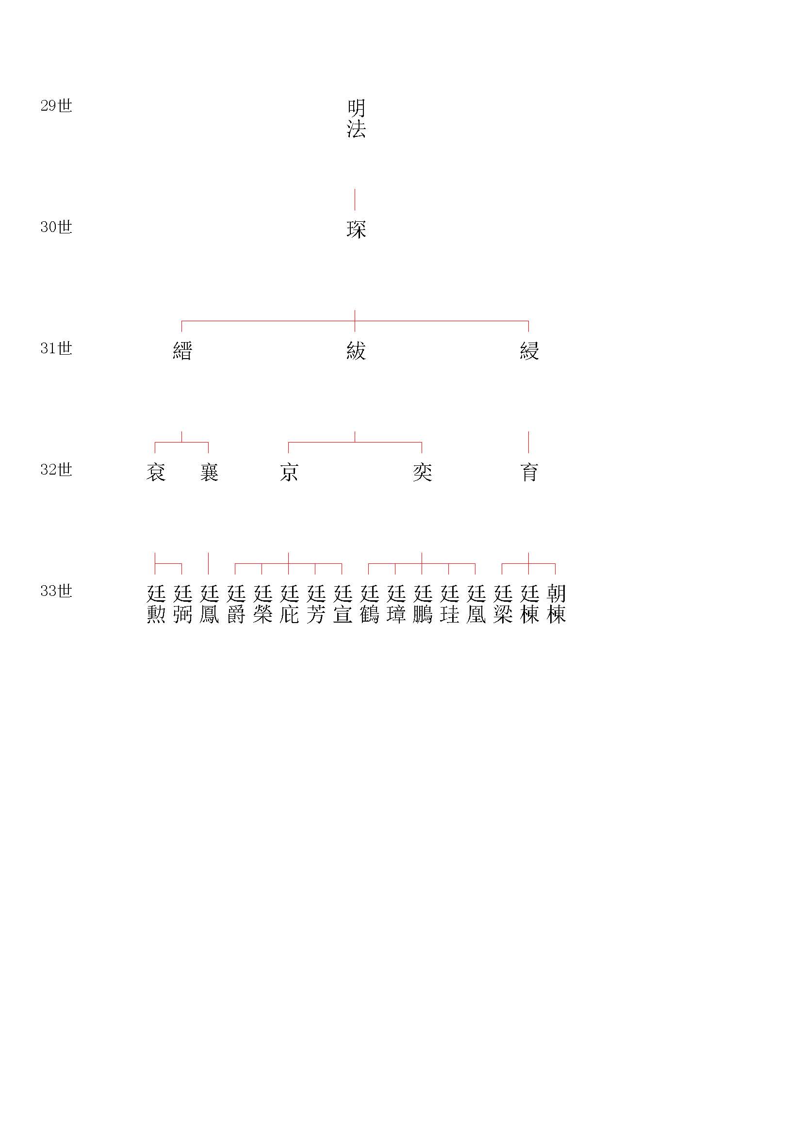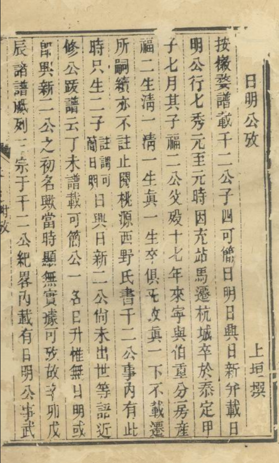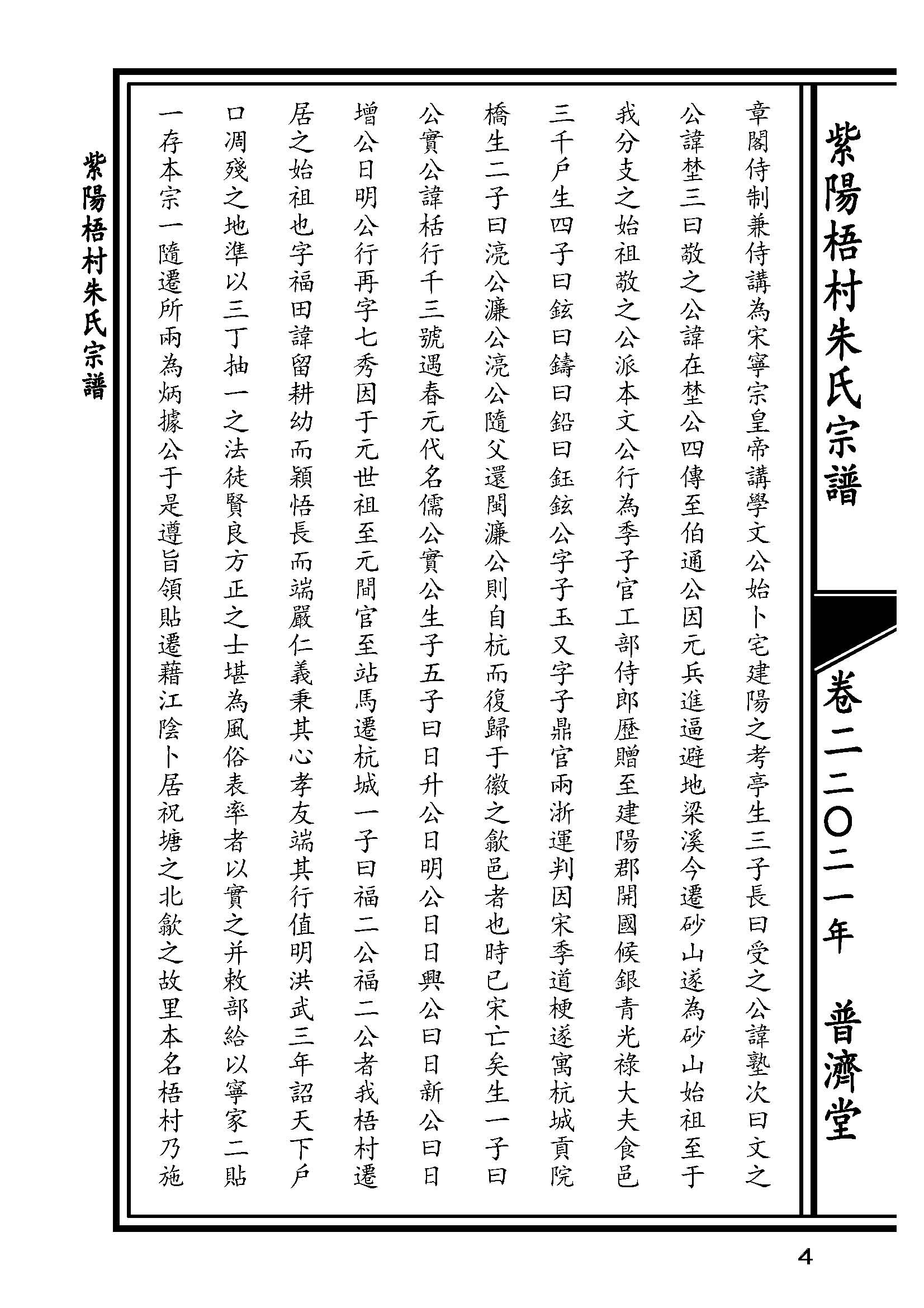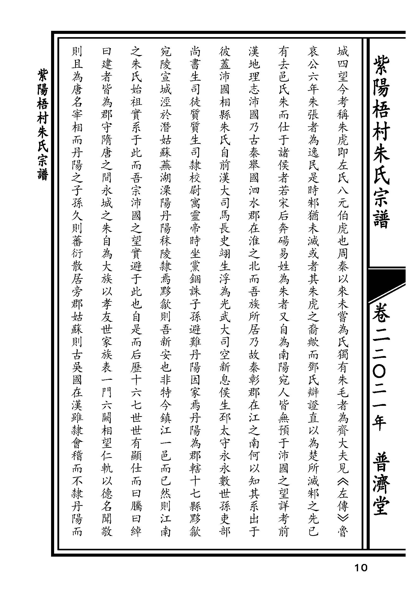 续正宗谱子孙之责其法溯根别支派尊祖敬宗收族以广孝焉然根源可溯而支派难别何也凡氏族一传舟传以至数傳后往往近者远亲者䟱同处里閈覿面猶若路人况值变故经乱离遷徒靡常者乎时移世易寝湮没不可考矣先儒谓十年不修谱为不孝其言可思也吾族四十二世孙明百般寻溯四海求考執崇本堂旧谱为溯本以傍系源谱得求证於共和国七十二年辛丑新修族谱告成吾梧村朱氏本出于古颛顼之后颛帝高阳者黄帝之孙昌意之子也高阳生称称生卷章卷章生重黎为帝喾高辛火正甚有功能光天下命为祝融共工氏作乱帝喾使重黎诛之而不尽帝诛重黎而以其弟吴回复为重黎居火正为祝融吴回生陆终陆终生子六人剖折(胁)而产焉长曰昆吾其后为卫次曰参胡其后为韩三曰彭祖其后为彭城四曰会人其后为郑五曰曹姓其后为朱(邾)六曰季连芈姓其后为楚陆终之第五子曰安尧封于邾历夏商世守焉周武王定鼎仍封安裔侠于邾附庸于鲁于鲁传十二世仪父从齐桓公朝周春秋美之平王锡为子爵又九传至桓公革为楚所并子孙因去邑为姓其后星居列国族之望者有九曰沛国曰吴郡曰丹阳曰永城曰钱塘曰义阳曰太原曰河南曰云阳此朱氏得姓之源流也吴郡始自丰沛之下邳有讳肇者避和帝讳更名梁举孝廉擢冀州守进御史中丞拜殿中尚书因党锢变上疏请开党禁灵帝疑为党人游说建宁三年公元一七一年谪守苏州子孙遂籍吴郡墓在吴郡娄门外二里许苏州府志谓与顾综墓相近今顾氏世世祭扫若博访周谘犹可得也自梁公十三传至唐宏文馆学士子奢公以文鸣世太宗以儒林独步褒之又赐御书飞白四字曰“吴中首姓”此吴郡派之源流也子奢公苏州吴人也从乡人顾彪授《左氏春秋》善文辞隋大业中为直秘书学士天下乱辞疾还乡里后从杜伏威入朝授国子助教自子奢公八传至介与明崇本堂一世祖介公生禹一因黄巢乱自吴郡避居金陵禹一生师古师古于干符戊戌公元八七八年又于金陵徙居徽之黄墩师古生四子长曰瓖次曰环三曰璋四曰瑾吾族四世祖环公古僚公讳瓌字舜臣行廿一师古公次子唐天佑元年公元九○四年奉歙县刺史陶雅偏将之命领兵三千镇戍婺源邑包括新县浮梁德兴祈门等四县唐天佑三年公元九〇六年十月由歙州刺史升任宣歙池平苏杭饶信八州观察使民赖以安遂从黄墩迁居婺源官制茶院使世称茶院府君谥文武追封为忠武侯越九世而文公诞生此徽州派之源流也十二世熹公字符晦又字仲晦号晦庵晚称晦翁谥文世称朱文公祖籍徽州府婺源县今江西省婺源出生于南剑州尤溪今属福建省尤溪县宋朝著名的理学家思想家哲学家教育家诗人闽学派的代表人物儒学集大成者世尊称为朱子朱熹是唯一非孔子亲传弟子而享祀孔庙位列大成殿十二哲者中受儒教祭祀①朱熹是“二程”程颢程颐的三传弟子李侗的学生与二程合称“程朱学派”朱熹的理学思想对元明清三朝影响很大成为三朝的官方哲学是中国教育史上继孔子后的又一人文公十九岁考中进士曾任江西南康福建漳州知府浙东巡抚做官清正有为振举书院建设官拜焕章阁侍制兼侍讲为宋宁宗皇帝讲学文公始卜宅建阳之考亭生三子长曰受之公讳塾次曰文之公讳埜三曰敬之公讳在埜公四传至伯通公因元兵进逼避地梁溪今迁砂山遂为砂山始祖至于我分支之始祖敬之公派本文公行为季子官工部侍郎歴赠至建阳郡开国候银青光禄大夫食邑三千户生四子曰铉曰铸曰铅曰钰铉公字子玉又字子鼎官两浙运判因宋季道梗遂寓杭城贡院桥生二子曰湸公濂公湸公随父还闽濂公则自杭而复归于徽之歙邑者也时已宋亡矣生一子曰公实公讳栝行千三号遇春元代名儒公实公生子五子曰日升公日明公日日兴公曰日新公曰日增公日明公行再字七秀因于元世祖至元间官至站马迁杭城一子曰福二公福二公者我梧村迁居之始祖也字福田讳留耕幼而颖悟长而端严仁义秉其心孝友端其行值明洪武三年诏天下户口凋残之地准以三丁抽一之法徒贤良方正之士堪为风俗表率者以实之并敕部给以宁家二贴一存本宗一随迁所两为炳据公于是遵旨领贴迁藉江阴卜居祝塘之北歙之故里本名梧村乃施旧号于新居示不忘本也里力挽颓风至今里人咸感其德慕其义亹亹称羡者不能释也传五世至巨川公讳湘广其田畴拓其基业又六世至守静公字振溪勤敏好义明神宗朝尝以督抚题准管督漕白二粮尚书赵公世卿三叹其能嘉其劳出缎疋白金以养守静公生伯珑公好儒术序次谱牒立家庙建普济庵于基左造家庙于宅东以修祭祀时际清明鼎革肘腋伏莽赖公百计维持未罹毒螫生子八人胄华公綅方来公绂天绅公缙言嘉公纶尔绅公䋧公锡公绮彦臣公䋼显莫公经公曰我有八子正合孝弟忠信礼义廉恥八字即以孝弟忠信礼义廉恥八字编行于谱使后世子孙易考易据不致混淆今之且读且耕以嗣以续用享成福者皆赖伯珑公之荫也