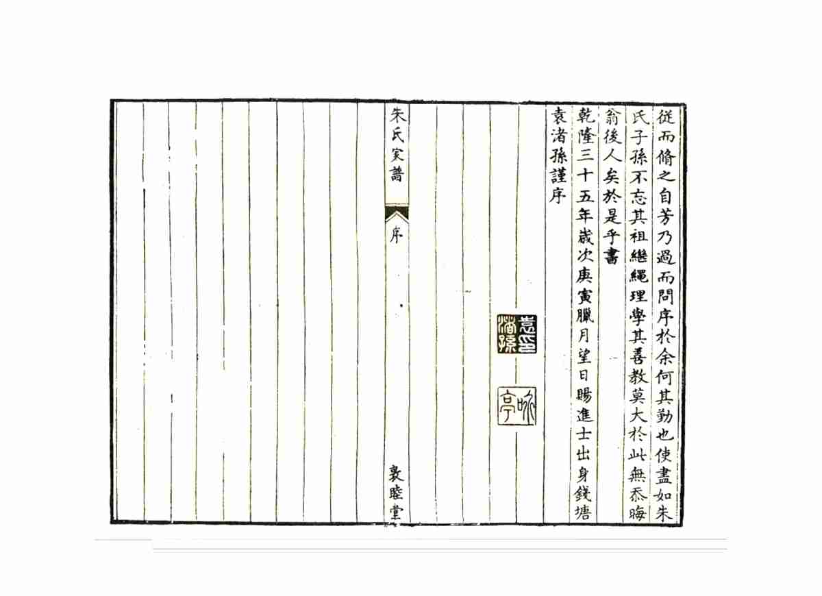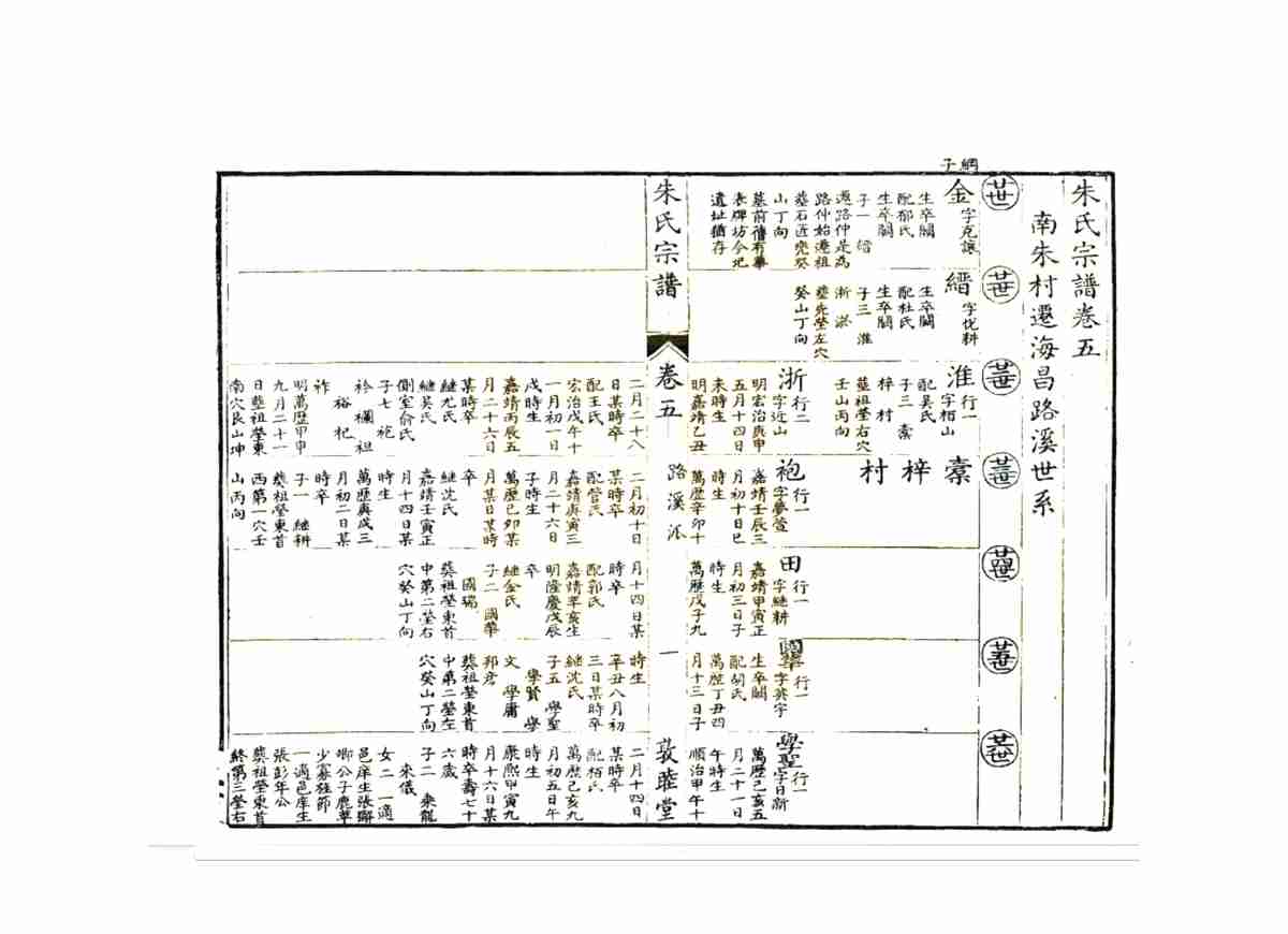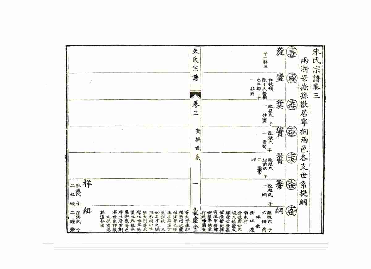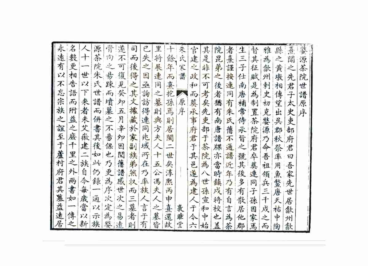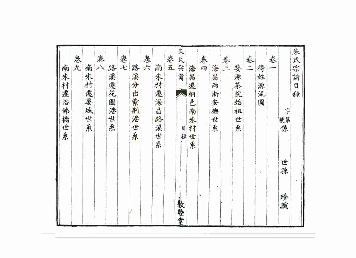 该家谱完整记录了南宋理学家、教育学家朱熹始祖始居婺源者讳环,即茶院使君,唐末因官自歙县黄墩迁来此处。宋元间名人弁、松、熹,皆出其族。自唐天佑三年(公元906年)从安徽歙县、篁墩迁徙到婺源的过程。这套宗谱还详细记录了朱熹返回婺源祭祖的过程,多篇朱熹著作及其后人介绍朱熹生平、思想的文章,其中一些文章属首次发现。卷首谱序、新安朱氏迁徙源流,卷一至八世系,卷末列传。该宗谱对于研究朱氏源流及朱熹思想,具有重要的史料价值。