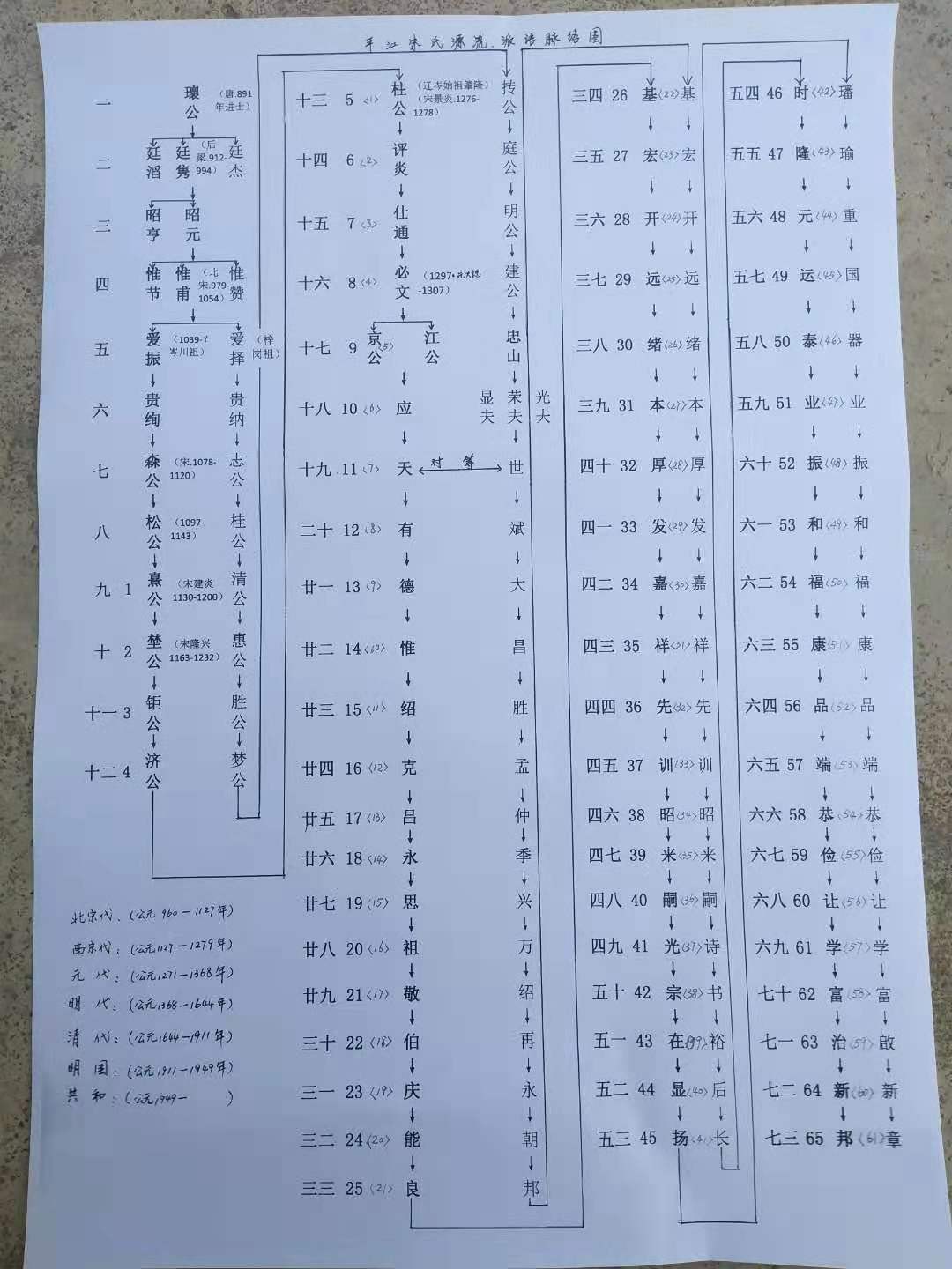 朱松生1097年卒1143生绍圣四年卒绍兴十三年 朱熹(1130-1200)生宋建炎四年,卒庆元六年十九岁婚配刘清四 朱松 历任著作郎、吏部郎等 职,世称吏部郎府君,赠 通议大夫,封粤国公,谥 献靖祀入圣庙。 朱熹 十九岁考中进士,曾任江西南康、 福建漳州知府、浙东巡抚,做官清 正有为,振举书院建设。官拜焕章 阁侍制兼侍讲,为宋宁宗皇帝讲学 。 平均 1154 埜 生绍兴二十四年卒嘉定四年 朱埜 宋徽州婺源人,徙居建阳,字文之 。朱熹次子。以荫补迪功郎,差监 湖州德清县户部赡军酒库。卒赠朝 散大夫。 1174 钜 南宋淳熙元年 20 1194 济 南宋绍熙五年 1214 柱 南宋嘉定七年 1234 炎 南宋端平元年 1254 仕通 南宋宝祐二年 1274 毕文 南宋咸淳十年 显庸 显登 历史年号 朱家堰 从元大德到明嘉靖24岁一代人 平均年龄/辈 生于1302 1302 生于1299 1299 元大德三年 从数据推算盛公五子奎 24 仁隆 1326 仁贤 1323 元至治三年 天申 天梁 1350 天坤 1347 元至正七年 应是我二世四公 有敬 1374 有璠 1371 明洪武四年 林德 1398 德圣 1395 明洪武二十八年 唯易 1422 帮栋 1419 明永乐十七年 瑛 1446 1443 明正统八年 我系族人应为显登公后 盛 兴 1470 1467 明成化三年 始祖由东里店南下,为一世祖 光、明、隽、祚、奎 1494 1494 明弘治七年 二世四公正德七年去沙河生春 春 1529 1529 嘉靖八年 三世講谏谦 講谏谦 30 梓生于1542年 1564 1564 嘉靖四十三 四世 应 1599 1599 万历二十七年 五世勋、花、荣 万历二十年1592年立碑 35 可 1634 1634 崇祯七年 六世光耀 从嘉靖到康熙约35岁一代人 从 1669 1669 康熙八年 七世君、臣 之 1704 1704 康熙四十三年 八世得美 继 1734 1734 雍正十二年 九世宝、玲、圣 宝、玲、圣 克 1764 1764 乾隆二十九年 十世士 乾隆21年1756年立碑 希 1794 1794 乾隆五十九年 十一世凤 尧 1824 1824 道光四年 十二世文 舜 1854 1854 咸丰四年 十三世明 世 1884 1884 光绪十年 十四世志 从康熙到现今约30岁一代人 时 1914 1914 民国四年 十五世有 崇 1944 1944 民国三十四年 十六世宗 孔 1974 1974 1974 共和国25年 十七世元财 26 孟 2000 2000 十八世立 文 2026 2026 十九世国