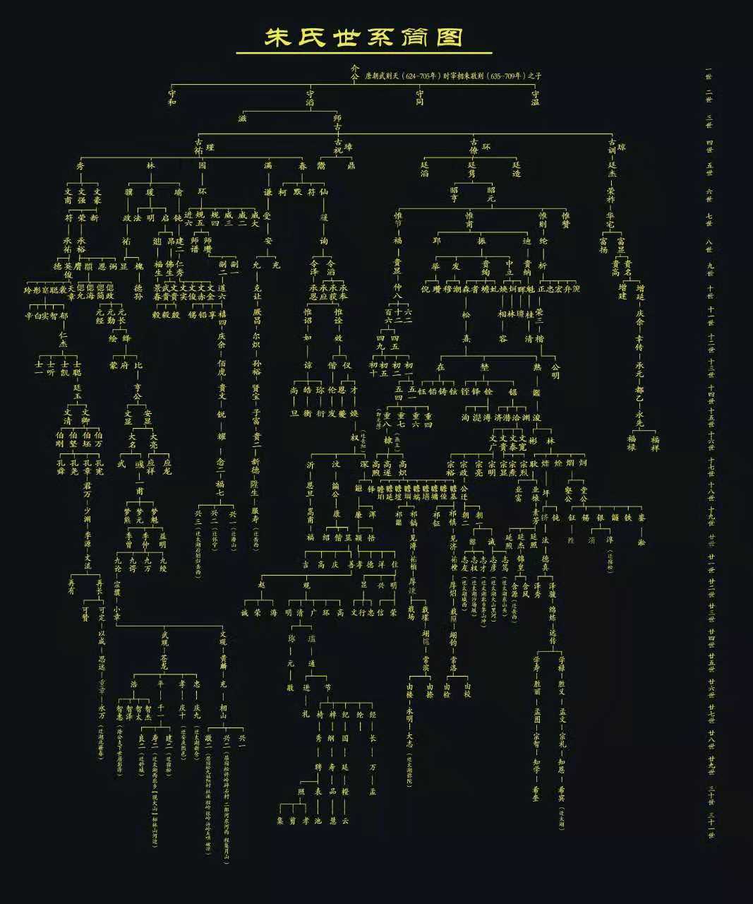 一、远古源流世系 人之有祖,犹木之有木,水之有源。故古人每岁孟春聚会以修谱,敦睦族情,而亲亲孝思之人,仰报先世积累之德,衍绵绵之泽无穷。文公有曰:“明伦之所以正分,辨姓之所以端本,古宗谱岂容荒废”。 考我朱姓祖先,乃始于古代,一直追溯到黄帝,大约公元前 27 世纪,中国中原地区的华夏民族开始建立起最早的国家政权——酋邦,并产生了中国历史上最早的一位君主。这位君主的称号,就叫做“黄帝”。 黄帝本姓公孙,他的父亲原是统治今河南省新郑一带的有熊国的君主,名叫少典。因生在轩辕,就取名叫“轩辕”。少典娶有蟜氏部族的女子附宝为妻。后来,黄帝成为部族首领,他的部族主要活动在姬水流域,他因此又以姬为姓。黄帝在位 100 年,活了 111 岁才去世,葬在桥山,其墓即今陕西省黄陵县北桥山的黄帝陵。 黄帝一生娶了 4 位夫人,生了 25 个儿子。其中,正妃累祖生 2 子:昌意、玄嚣。昌意一支,居住在若水(即今青海墨曲、四川若尔盖和岷江上游—带。 黄帝生昌意,昌意生韩流,韩流生颛顼(高阳氏),颛顼像他的祖先黄帝一样,也是中国历史上的一个大圣大贤之人。他出生在若水,少年时随着部族不断顺黄河流域东迁,后加入少昊东夷部落,定居于穷桑(今山东曲阜县)一带,因此又号穷桑氏。颛顼少负大才,年仅 10 岁,便成为东夷部落首领少昊的得力助手,20 岁时,便继承少昊的帝位,成为东夷部落酋邦的首领,建都穷桑。颛顼生称,称生卷章(又曰老童),卷章生重黎和吴回,吴回生陆终。陆终生六子,第五曰晏安,赐曹姓。周武王克商,封安的苗裔曹侠于邾国。子孙以国为姓(邾)。