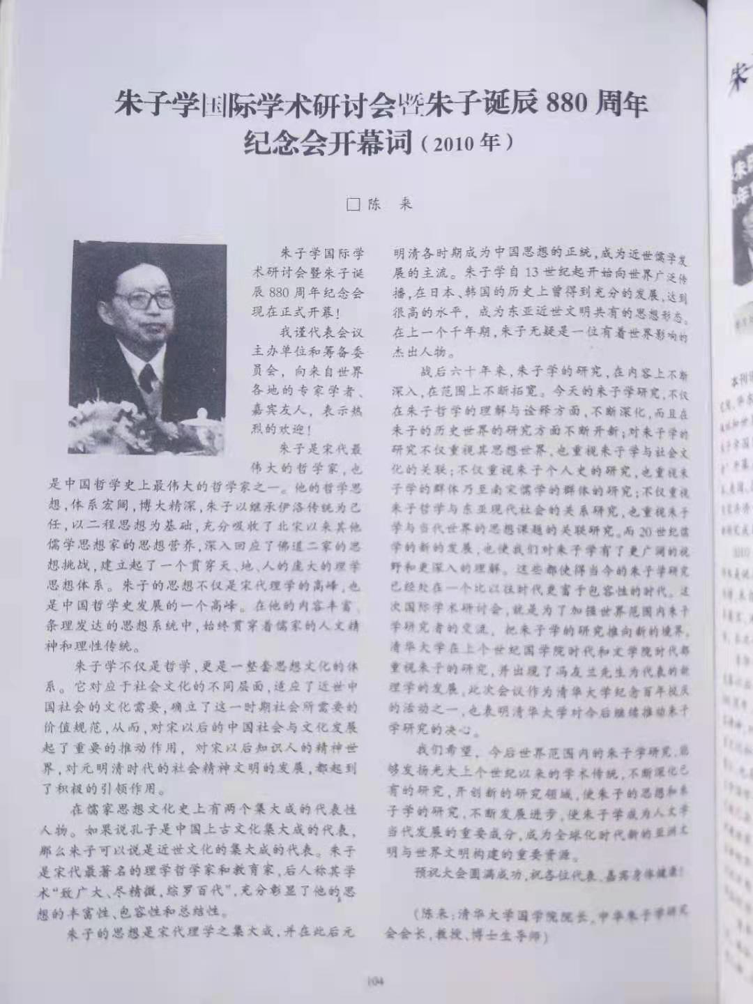 本刊讯(2010年) 10月19日上午,在北京人民大会堂重庆厅举行的“朱子学国际学术研讨会暨朱子诞辰880周年纪念会”开幕式上,清华大学国学院院长、著名的朱子学研究专家陈来致词并宣布,中华朱子研究会成立。他向与会者介绍了这一全国性学术组织的基本概况。该会由张立文、蒙培元、陈俊民等任顾问,陈来任会长,朱杰人任常务副会长兼秘书长,束景南、李甦平、蔡方鹿、朱汉民任副会长。来自全国各相关研究机构和高等学府的 40多位知名的朱于学研究专家、教授为该研究会的理事。美国亚利桑那州立大学教授、著名的朱子学专家田浩是研究会的名誉会员。据悉,中华朱子研究会秘书处设在华东师范大学朱熹研究中心。
