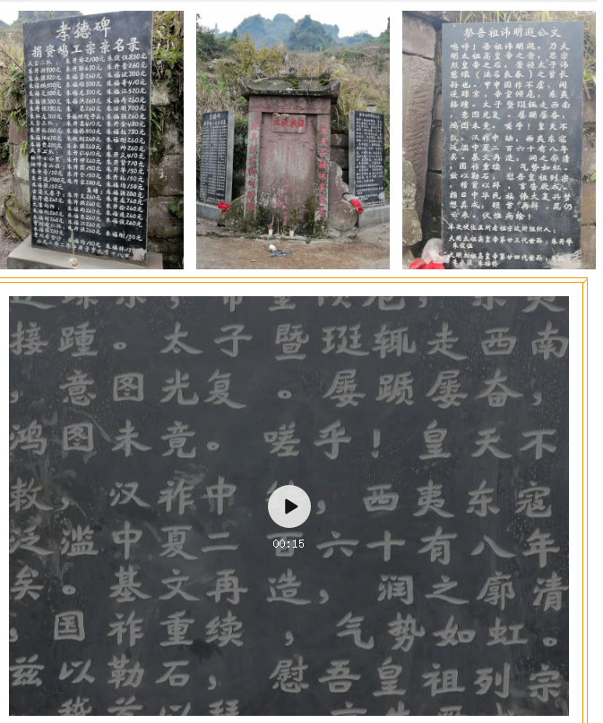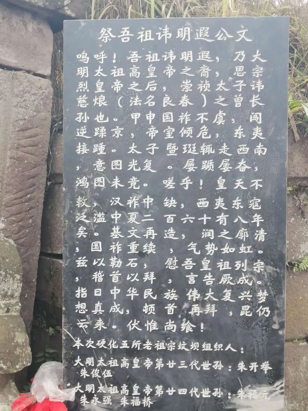 呜呼!吾祖讳明遐,乃大明太祖高皇帝之裔,思宗烈皇帝之后,崇祯太子讳慈烺(法名良春)之曾长孙也。甲申国祚不虞,闯逆蹂京,帝室倾危,东夷接踵。太子暨珽辄走西南,意图光复。屡踬屡奋,鸿图未竞。嗟乎!皇天不敕,汉祚中缺,西夷东寇泛滥中夏二百六十有八年矣。基文再造,润之廓清,国祚重续,气势如虹,兹以勒石,慰吾皇祖列宗,稽首以拜,言告厥成。指日中华民族伟大复兴梦想真成,顿首再拜,昆仍云来,伏惟尚飨!