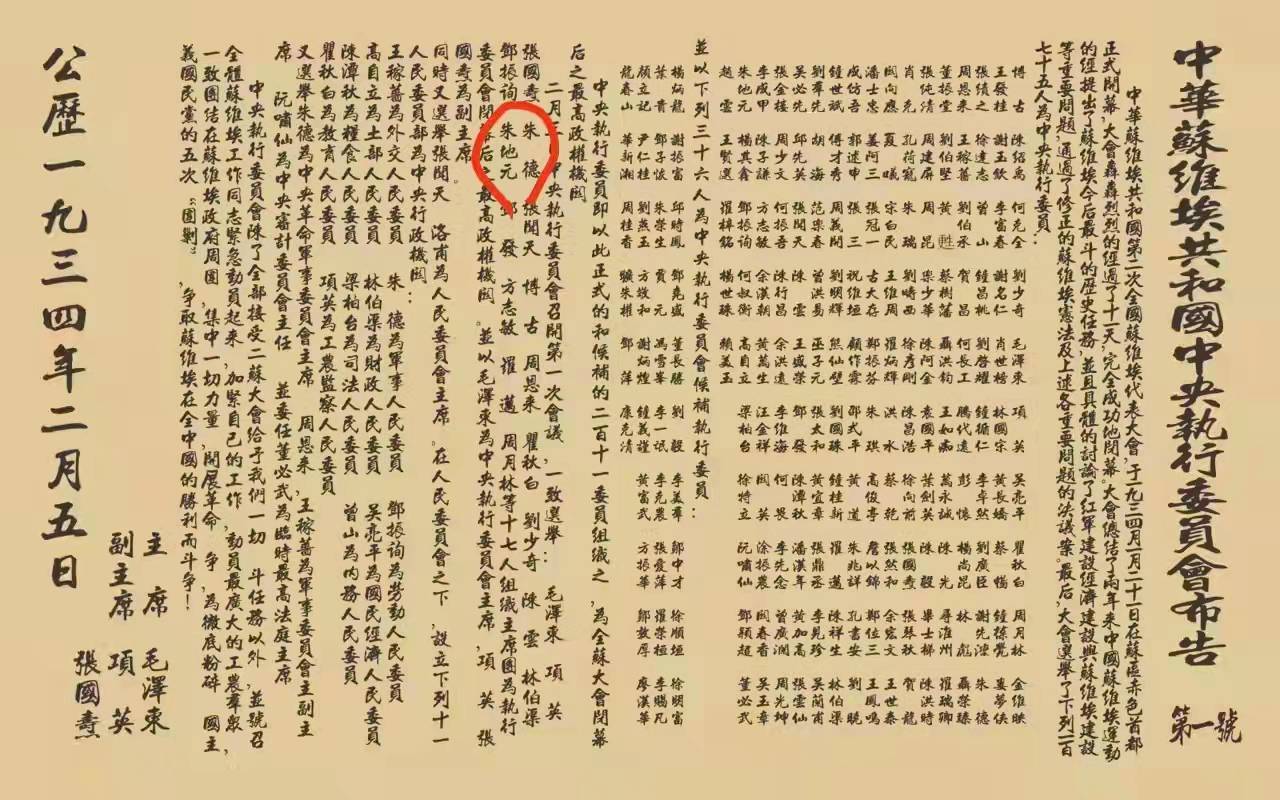 朱地元(1908--1983)赣县人。家庭贫寒,15岁当长工。投身土地革命,1929年,加入中国共产党,1930年,任乡苏维埃政府土地委员。7月,在苏区赣县第一次工人代表大会上当选为县雇农工会委员长。12月,江西省雇农工会成立,任省雇农工会组织部长。1932年2月.当选为江西省农业工人工会委员长。1933年初,调中华全国总工会苏区中央执行局工作,负责筹组中国农业工人工会。与全总苏区中央执行局委员长刘少奇共用一间办公室,朝夕相处,大受教益。4月,当选为中国农业工人工会中央执行委员会委员长。1934年1月,出席中华苏维埃第二次全国代表大会,当选为苏维埃中央执行委员,2月1日,大会通过了由175人组成的中央政府中央执行委员会名单。2月3日,中央执行委员会召开了第一次会议。175只手高高举起,通过了毛泽东、项英、张国焘、朱德、张闻天、博古、周恩来、瞿秋白、刘少奇、陈云、林伯渠、邓振询、朱地元、邓发、方志敏、罗迈、周月林等17人组成主席团(相当于中执常委)。毛泽东为中央政府执行委员会主席(相当于国家主席),项英、张国焘为副主席。