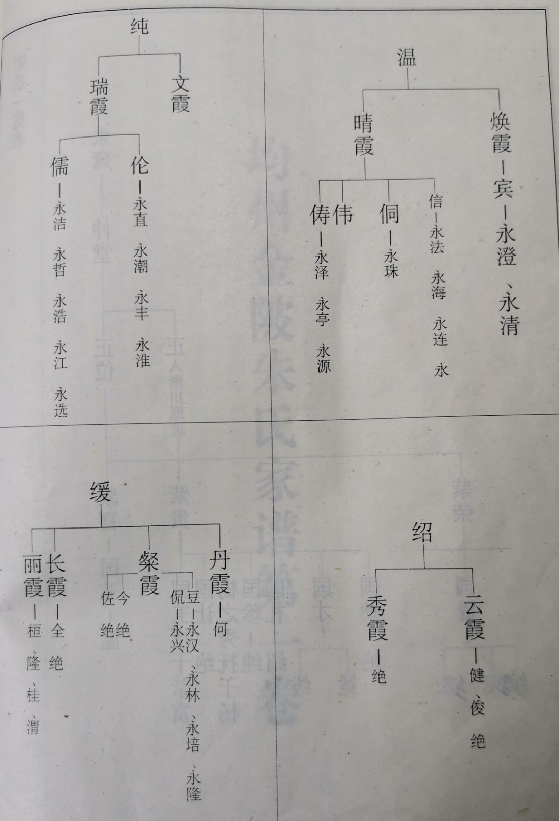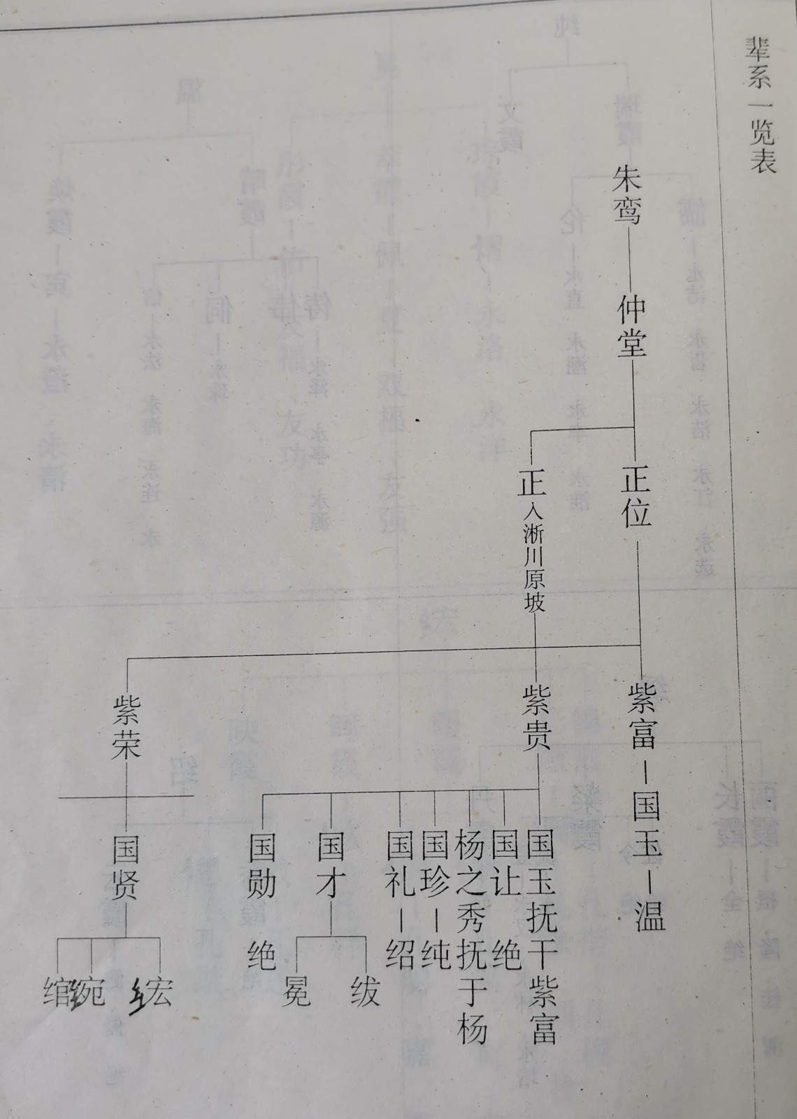 现特寻与此三支有关及丹江水库淹没分散的朱氏宗亲。九世祖孔摸与其子升元所续谱辈系与前上传为据,即:一世鸾,二世仲堂,三世正位,依次派序:紫,国,系,霞,亻,孔,元,秉。家道延庆,大启龙光,锡寿增福,万世鸿昌。后十六派为后来2000年续增。