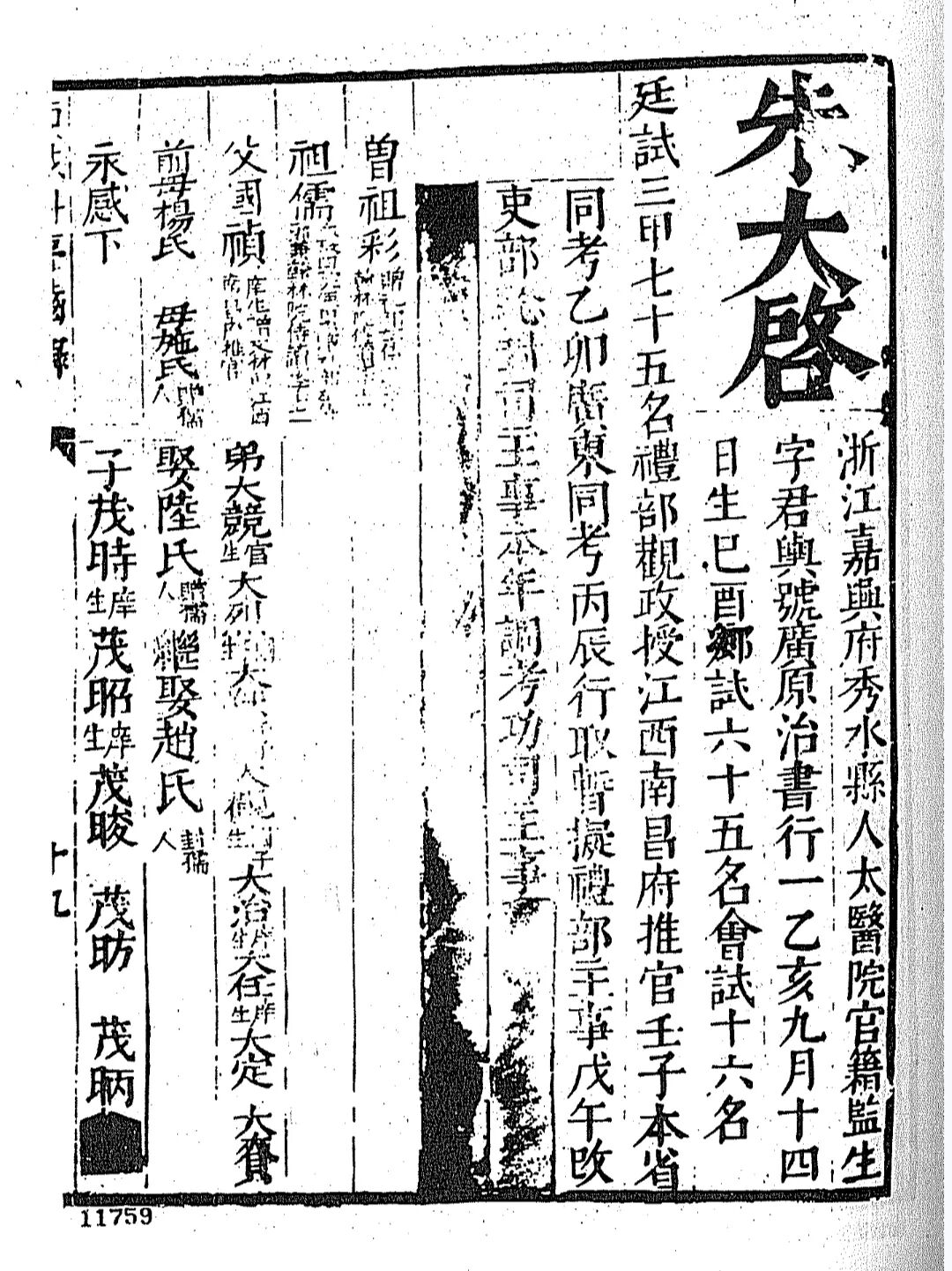一、生平履历:从科举入仕到宦海浮沉朱大启(1575—1642),字君舆,号广原,浙江嘉兴府秀水县人,太医院官籍监生出身,生辰为万历三年(1575年)乙亥九月十四日。其仕途以科举为起点,逐步跻身明代官僚体系核心:(一)科举进阶乡试:万历三十七年(1609年)己酉科,中顺天府乡试第六十五名举人。会试与廷试:万历三十八年(1610年)联捷庚戌科进士,廷试位列第三甲第七十五名,获“同进士出身”,后赴礼部观政学习政务。(二)仕途迁转地方治政:初授江西南昌府推官,主掌一府刑狱事务;任内曾与戏曲家汤显祖有书信往来,可见其文人交游网络。典试与行取:-万历四十年(1612年)任江西省乡试同考官,万历四十三年(1615年)调任广东省乡试同考官,负责人才荐举。-万历四十四年(1616年)经“行取”入京,暂摄礼部主事;万历四十六年(1618年)改任吏部验封司主事,旋调考功司主事,后升考功司郎中,掌官员考核之权。天启年间风波:-天启五年(1625年)任文选司郎中,因反对魏忠贤派遣宦官镇守九边之议,草拟公疏触怒权宦,被罢官归乡。-天启七年(1627年)魏忠贤倒台后,起复为太常寺少卿、提督四夷馆。-崇祯朝晋升:崇祯元年(1628年)升太仆寺卿,转任大理寺卿,最终官至刑部左侍郎;崇祯十五年(1642年)去世,获赠刑部尚书。二、家族关系:医宦世家到科举望族的转型朱大启家族源自直隶吴江盛泽(今江苏),明景泰四年(1453年)始祖朱煜迁居秀水,逐步发展为地方望族,其谱系可考者如下:(一)祖辈与父辈-祖辈:-六世祖朱恭,获“乡饮宾”荣誉,后因后裔朱国祚显贵,追赠光禄大夫、柱国、少保等衔。-高祖朱儒(字宗鲁,号东山),以医术闻名,官至奉政大夫、太医院院使,曾为明神宗诊脉、为宫眷治病,医德卓著,是秀水医派代表人物。-曾祖朱彩,赠太子太保、翰林院侍读学士;祖父朱儒(与高祖名同,或为记载差异),官太医院使,累赠礼部左侍郎兼翰林院侍读学士。-父辈:- 父朱国祯,为庠生(秀才),因朱大启仕进,赠文林郎、江西南昌府推官衔。-叔父朱国祚,万历癸未科(1583年)状元,官至户部尚书兼武英殿大学士,卒赠太傅,谥文恪,是家族中最具权势者,朱大启受其影响甚深。(二)母辈、婚姻与子嗣母辈:前母杨氏,生母施氏,因朱大启显贵,封赠孺人。婚姻:文献未详载妻室细节,但明确其身后有子多人。子嗣:育有五子——朱茂时、朱茂昭、朱茂晙、朱茂昉、朱茂昞,均为庠生(秀才),延续家族“诗书传家”传统。兄弟:弟朱大競,官至太仆寺属官,与朱大启仕途路径互补。三、社会文化语境:江南士绅的典型镜像朱大启家族的发展轨迹,映射出明代江南士绅阶层的核心特征:(一)阶层流动与文化权力家族从“太医院官籍”起步,以医术立足,再通过朱国祚、朱大启的科举成功,实现向科举仕宦家族的转型。士绅阶层凭借功名掌握文化资源,参与地方事务,形成独特的“文化权力”。(二)城居化与精神世界明代中后期江南士大夫多选择城居,朱大启家族定居秀水(嘉兴),与乡村庶民生活空间逐渐分离。其罢官乡居时,与僧人秋潭、萍踪交游,诗作(见《曼寄轩集》)多禅意,反映了政治失意时的精神寄托。(三)门风与道德自觉朱大启为人“温谨不苟同”,明末党争中“独称完节”;家族虽官至卿贰,仍守清廉,他曾自谓“官阶三品,恆产倍于保傅(叔父朱国祚),死何以见叔父”,彰显清节自持的门风。结语朱大启的一生,既是个人“由医入仕”的仕途史,也是家族“医宦—科举”转型的缩影。其家族通过科举、联姻、师友网络,在嘉兴构建起士绅网络,成为明代江南士大夫阶层的典型样本。对其生平与家族的考辨,为理解明代江南地域文化、士绅生活及社会结构提供了重要个案。(注:文中部分谱系记载存疑处,如“祖父朱儒”与“高祖朱儒”的名称重合,需结合《嘉兴府志》《曝书亭集》等地方文献进一步校勘。反馈电话:19819884266)