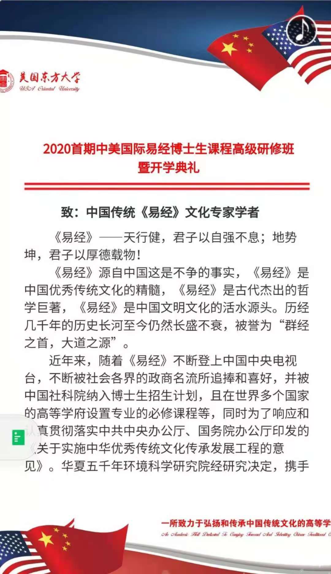 “2020首期中美国际易经博士生课程高级研修班”由华夏五千年环境科学研究院主办。