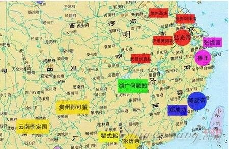 顺治元年(1644)五月十五日,福王朱由崧在丹阳总督马士英等人拥戴下,在南京称帝,建元弘光。福王政权一方面抵御清军南下,一方面继续剿杀农民军。顺治二年春,清军始攻福王。福王政权内部正在进行激烈的党争和内战,只有兵部尚书史可法督师江北,坚决抗战,死守扬州。清军攻下扬州,杀害了宁死不降的史可法,并实行屠城。五月清军占南京,俘虏福王。弘光政权仅仅维持一年就灭亡了。当年六月,故明官吏、缙绅钱肃乐等扶植鲁王朱以海监国于绍兴,建立政权。鲁王依据钱塘江天险,与清军相持一年,至顺治三年五月绍兴城破,鲁王出走而覆灭。在鲁王监国的同时,故明官吏黄道周和军阀郑芝龙等迎唐王朱聿键在福州称帝,建号隆武。但两政权不能合力抗清,反而互争“正统”,彼此水火不容。清廷诱降了拥有重兵的郑芝龙,在攻下两浙之后兵入福建,消灭了隆武政权。顺治三年十一月,故明官僚苏观生等人拥立隆武帝的弟弟朱聿鐭在广州称帝,年号绍武,而仅过了40多天清军攻陷广州便灭亡了。绍武政权创立的同时,由两广官吏瞿式耜、丁魁楚在肇庆拥立桂王朱由榔为帝,改元永历。初期与广州唐王绍武政权互争“正统”,清军乘其内战,攻入广东,桂王奔逃于两广。此后由于抗清坚决的何腾蛟、堵胤锡、瞿式耜等将领力战,并得到大顺军、大西军的支持,政权方得以维持。顺治十三年李定国迎桂王到云南。顺治十五年吴三桂攻入云南,于顺治十八年入缅甸俘获桂王,支撑16年之久的桂王政权终于灭亡了。