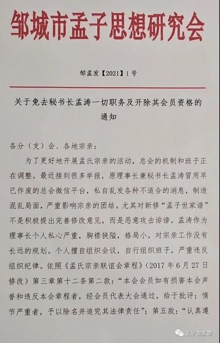各分(支)会、各地宗亲: 为了更好地开展孟氏宗亲的活动,总会的机制和班子正在调整。最近接到很多举报,原理事长兼秘书长孟涛冒用早已作废的总会微信平台,私自乱发各种不适合的信息,制造混乱局面,严重影响宗亲的团结。尤其对新修“孟子世家谱”不是积极提出完善修改意见,而是恶意攻击诽谤。孟涛作为理事长个人私心严重,胸襟狭隘,格局小,对宗亲工作没有长远的规划。个人擅自组织会议,自行组织班子,严重违反组织纪律。