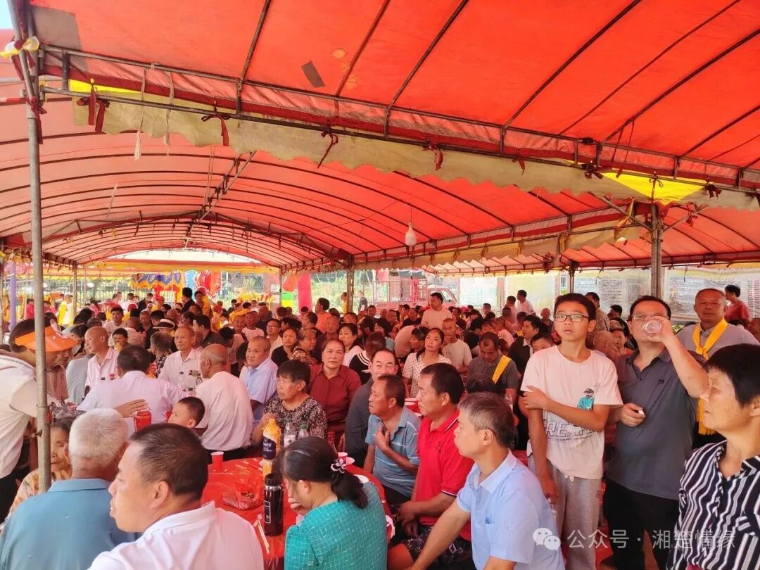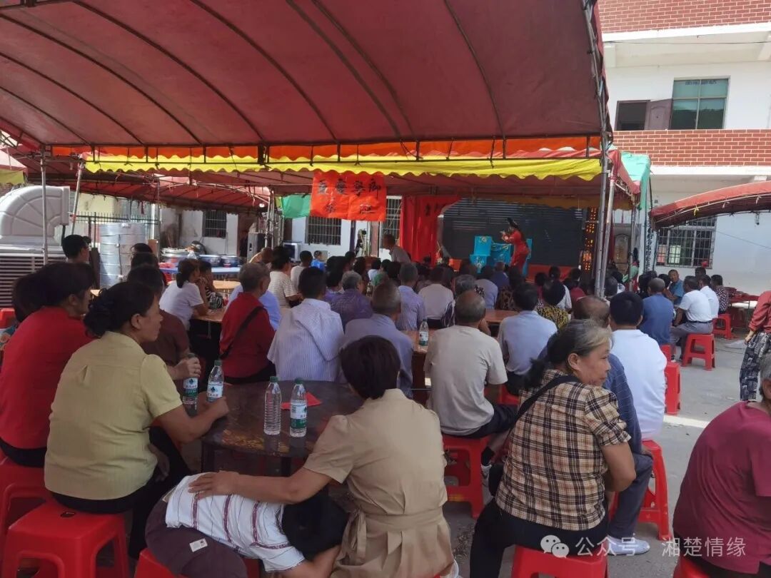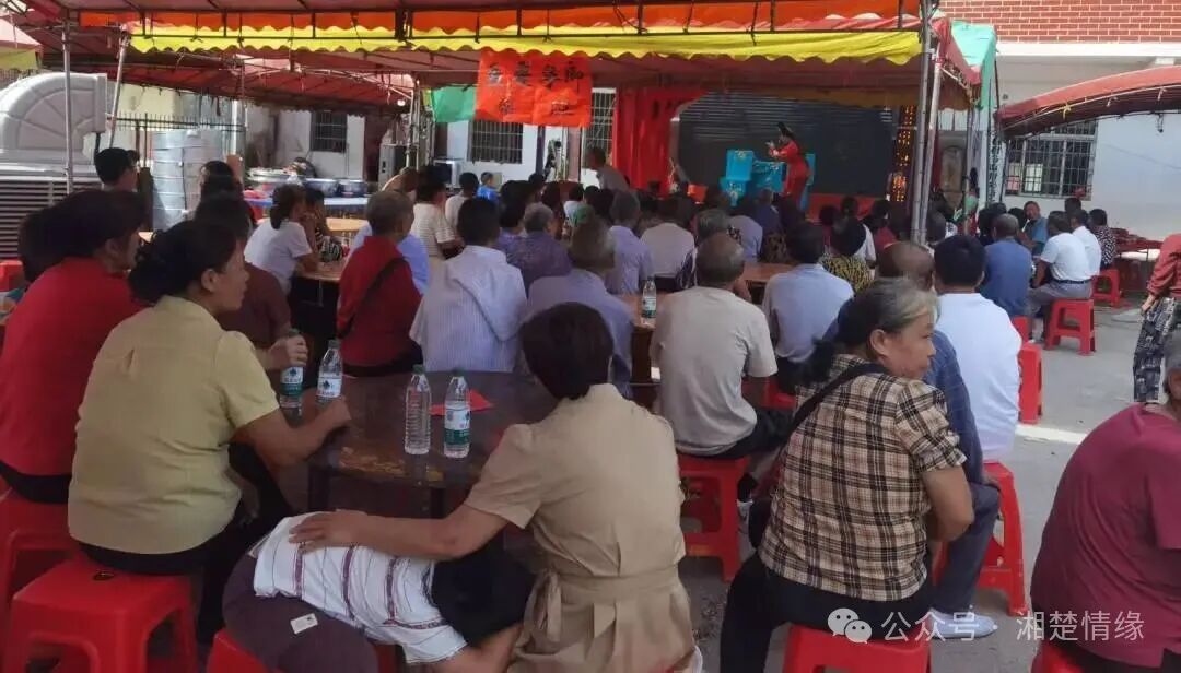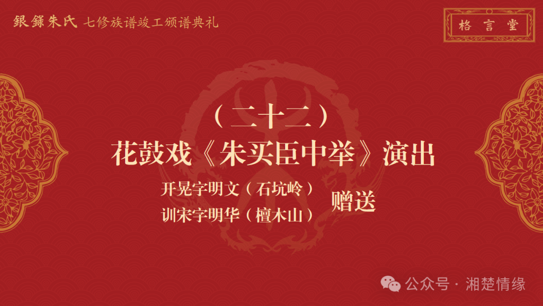 招待午宴后,由石坑岭的开晃字明文、檀木山的训宋字明华二位族贤赞助的湖南地方特色花鼓戏《朱买臣中举》开演。
