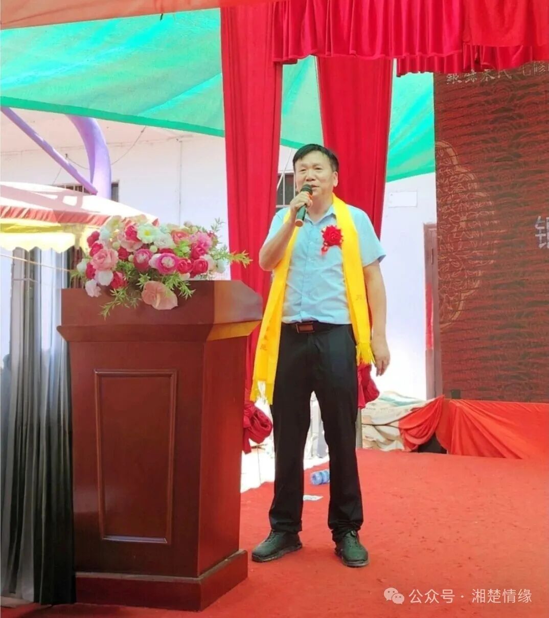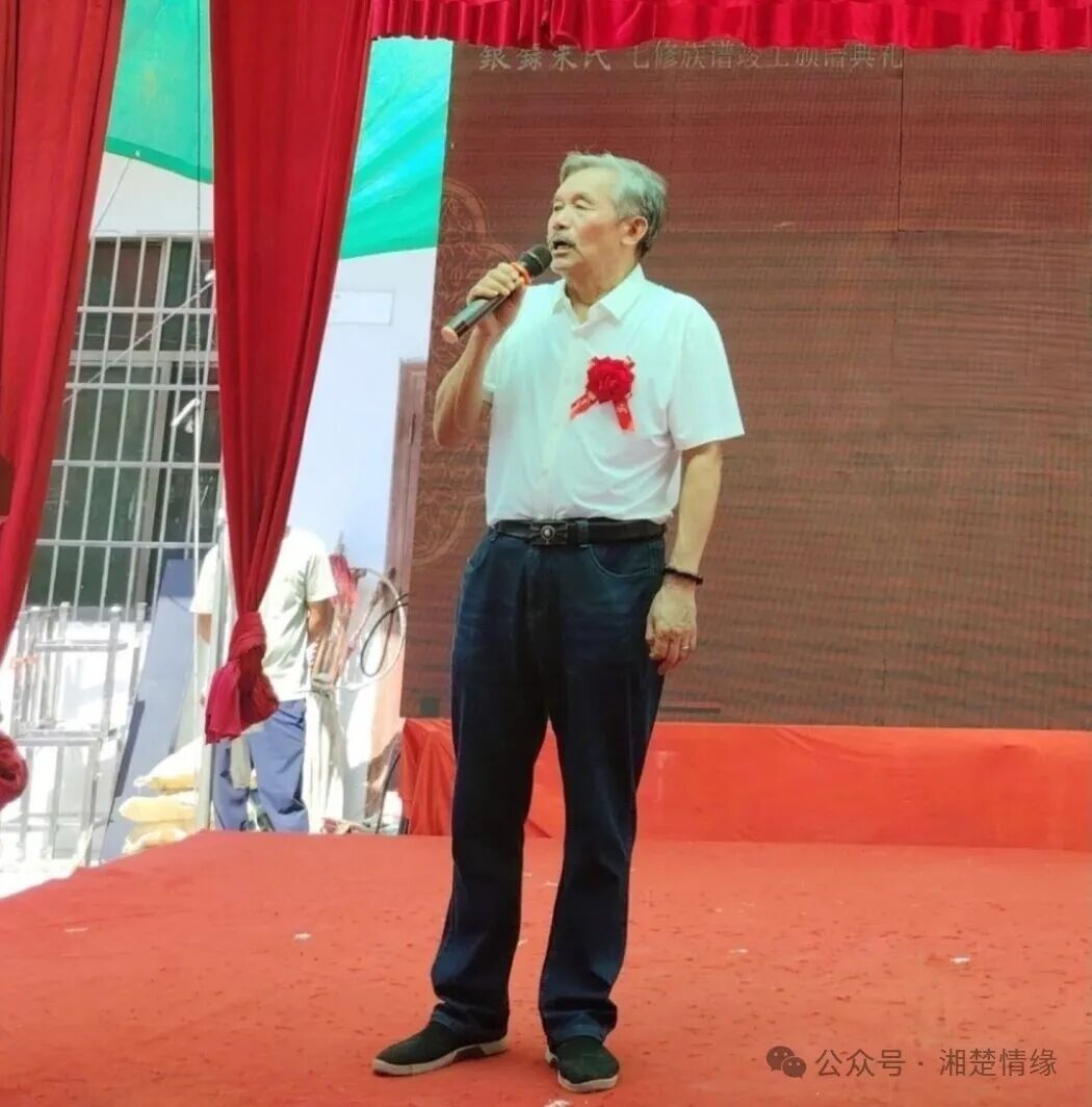 在悠扬的音乐声中,七修主修兼倡修开晃字明文明文先生缓步走上主席台,音乐停止后,他首先对到场的嘉宾、宗亲表示热烈欢迎与衷心感谢。随后,他回顾了七修族谱的筹备与编纂过程,同时强调了修谱对续接家族根脉、凝聚宗亲力量的重要意义。他的话语情真意切,既饱含对宗亲付出的感恩,也传递出传承家族文化、助力家族发展的坚定信念,赢得台下阵阵掌声。