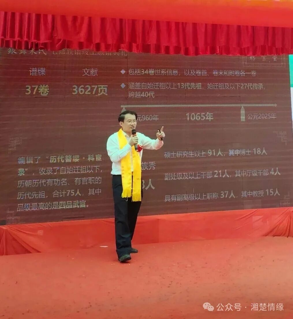 金秋十月,丹桂飘香,祖德流芳,宗亲齐聚。2025年10月3日,银录朱氏家族迎来发展史上里程碑式的盛典——七修族谱竣工颁谱典礼。来自全国各地的银录朱氏宗亲、兄弟宗派嘉宾及社会各界朋友欢聚一堂,共同见证这一承载家族记忆、传承文化根脉的重要时刻。颁谱典礼由俊福公廿三世荣房后裔、七修族谱主编兼纂修——开银字海洋博士主持。