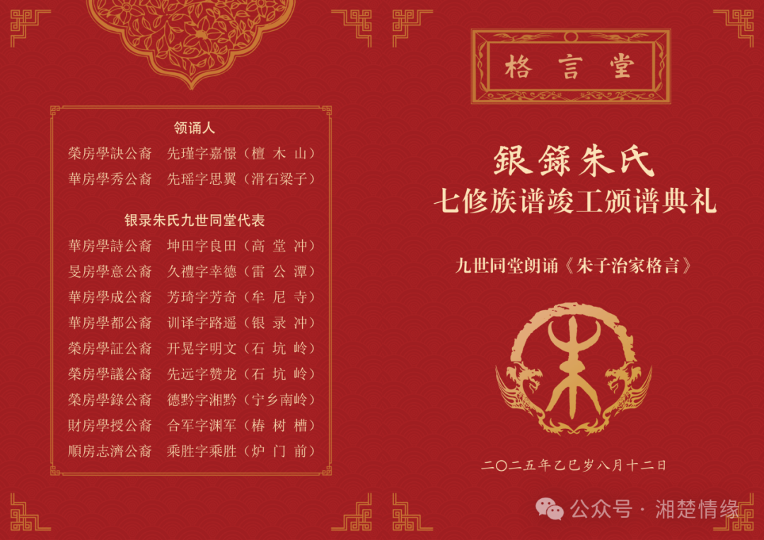 银录朱氏此次修谱为九世同堂,健在族裔中班辈最高的为坤字辈,最低的为乘字辈。典礼现场,9位不同班辈的宗亲代表上台,共同朗诵明末清初著名理学家、教育家朱伯庐撰写的《朱子治家格言》。