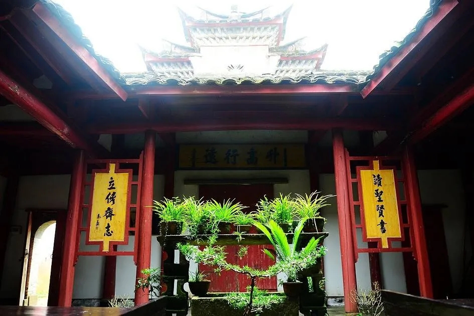 兴贤书院的正面是一座青砖灰瓦层层台阶的重檐马头墙式的门牌楼,这种以门牌楼为房屋重点装饰的建筑造型是独特的闽北民居风格。不过,像兴贤书院这样四五层飞檐重叠,并饰以大量精致卓绝的砖雕刻画的,充分彰显其超人的地位与荣华的门牌楼也只有在少数官宦富豪的大宅中才能见到。走进书院,正厅悬挂着朱子手书"继往开来"的匾,"为天地立心,为生民立命,为往圣继绝学,为万世开太平"才是读书人至高的追求担当……
