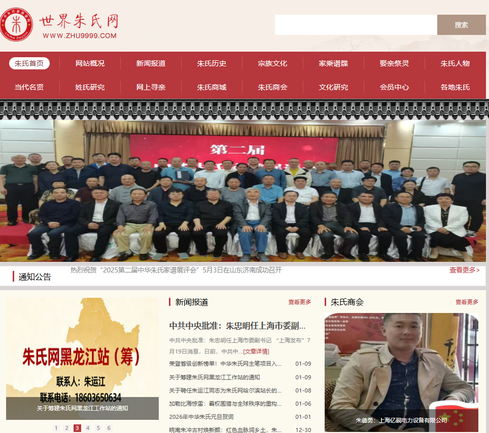 各位宗亲、各位朋友: 为弘扬朱氏优秀传统文化,加强宗亲之间的交流与合作,推动朱氏事业在新时代实现更高质量的发展,杭州朱府铜艺有限公司主办、中华朱氏网协办的朱氏年会及商务发展合作会议将于2026年1月19日在浙江省杭州市召开。本次会议将特别邀请知名朱氏代表参与,分享非遗文化传承经验与商务合作机遇。现将有关事项通知如下: 一、会议时间:2026年1月19日(星期一)下午2:00—5:00,会期约3小时,会后晚餐。 二、会议地点:浙江省杭州市上城区东方润园会所(报名后,分享微信地址)。 三、会议内容: 1.新春礼拜,共叙亲情,共话发展; 2.朱府铜艺非遗文化与品牌发展分享,介绍其百年传承与创新成果; 3.宗亲企业商务合作交流,探讨资源共享、项目合作与市场拓展机会; 4.公益礼品经销业务培训,获赠一套有朱炳新头像的“中华全国总工会成立一百周年纪念邮折”,为宗亲提供更多创业与合作渠道; 5.宗亲互动交流,增进情谊,共谋未来。 四、参会对象:中华朱氏网组织的宗亲、朱氏宗亲代表、朱氏企业负责人及关心支持朱氏事业发展的各界朋友。五、相关说明:本次会议为公益性质,不收任何费用,欢迎广大宗亲积极报名参加。 六、报名方式: 请有意参加的宗亲及时与中华朱氏网联系报名。 联系人:朱编辑,联系电话:19819884266。 杭州市上城区东方润园会所:联系人,朱炳新,18957100987。 特此邀请! 中华朱氏网 杭州朱府铜艺有限公司 2026 年 1 月