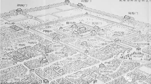 公元1368年,明太祖朱元璋在南京称帝开始了明朝的统治。朱棡是朱元璋的第三子,明洪武三年(1370年)他被父皇封为晋王。朱棡委托其岳父谢成修筑晋王府,几经考虑才决定在宋建太原城外东北面修建起一座富丽堂皇、规模宏大的晋王府,晋王府的落成时间在公元1376年前后。虽说,晋王府比不了南京的皇宫,但这三皇子也想在天高皇帝远的太原享受一下当皇帝的感觉。在朱棡的内心里这晋王府就是他的皇宫。从上世纪60年代初绘制的想象图上可见,在晋王府这座方形城池内南北中轴线上及周围建有宫殿无数,其格局类似皇宫。内城即宫城,辟有三个宫门,即今日仍称呼的“东华门”、“西华门”和“南华门”。北面有“后宰门”,那是为方便王府人员行走而开的王府后门。晋王府的宫城外围还建有四道城墙,就是现在仍称呼的东、西、南、北肖墙,“肖”实为“萧”,即“萧墙”。晋王府的西南有天地坛,是晋王祭祀天地的场所。东南和南面有“杏花岭”和“松花坡”,那是王府花园。西有典膳所,是管理王府膳食的地方,而晋府店则是供应王府生活用品的机构。明朝初年,晋王朱棡还修建了万寿宫(皇庙),新建和扩建了祟善寺等寺庙和祠堂,当年的兴旺可见一斑。朱棡的儿孙们当然是世袭为王,他们又在自己的领地内大兴土木修建王府并代代相传。至今称“府”的街名流传下来就有:“宁化府”、“临泉府”、“方山府”、“二府巷”等。至于平阳府、广昌府、宁河府、河东府、靖安府、荣泽府等王府现今已很少能听到了。“七府坟”则因朱棡的七子朱济(火高)与嫔妃刘氏、杨氏的合葬坟墓而得名。晋王朱棡死于明洪武三十一年(公元1398年),葬于南郊黄陵。“黄陵”应为“皇陵”,它是朱棡及其后裔诸晋王的皇家陵墓。从明初朱棡修建晋王府始,至明朝灭亡后的第三年,历史的年轮已经走过了260多年,也就是清顺治三年(1646年)的春天,晋王府不知何故突然烧起了大火,经久不息。这次火灾的结果使巍峨豪华的晋王府化为灰烬,晋王府从太原城内消失了。如果不是这场莫名的大火,不知晋王府是否可能像北京紫禁城一样仍然矗立至今?20年以后,清康熙五年(1666年),清代著名诗人屈大均来到太原,看到晋王府破败荒凉的样子,十分伤感地写下《望晋恭王园》诗一首,其中有“悲风处处吹松柏,谁到并州不断肠”的句子。到了清代雍正、乾隆年间,在晋王府废墟上修建起数千间兵营房舍,驻扎清军绿营兵精骑营。后来,人们就把这个驻兵的地方简称为“精营”了。今天恐怕是再难寻到晋王府的任何痕迹了。流传下来的只有称作“东丹墀”、“西丹墀”等许许多多的地名而已。