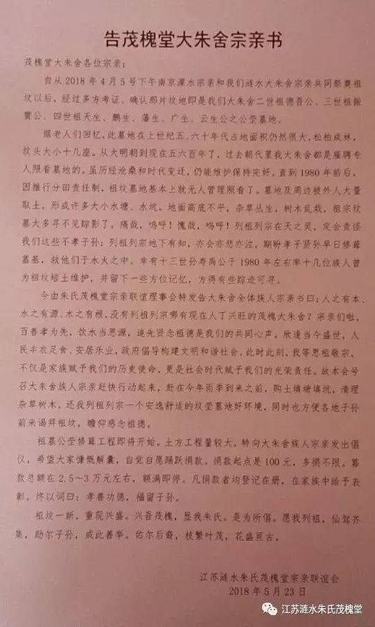 江苏涟水朱氏《茂槐堂》宗亲联谊会发出《告茂槐堂大朱舍宗亲书》