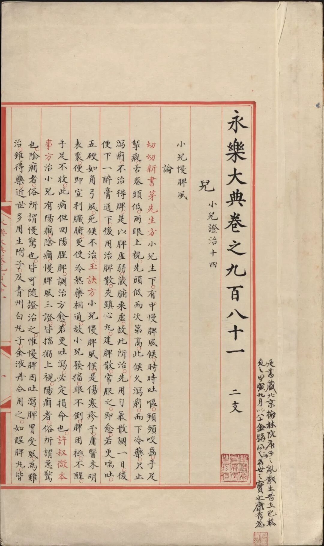 永乐大典.卷981.儿字.小儿证治十四.康有为收藏.哈佛大学图书馆藏