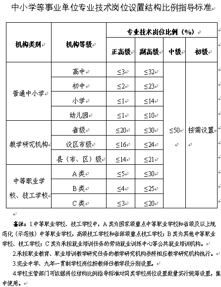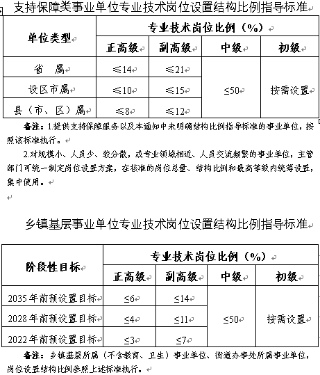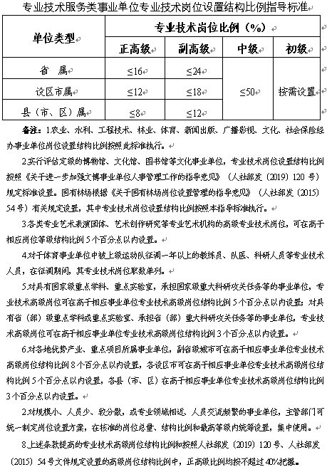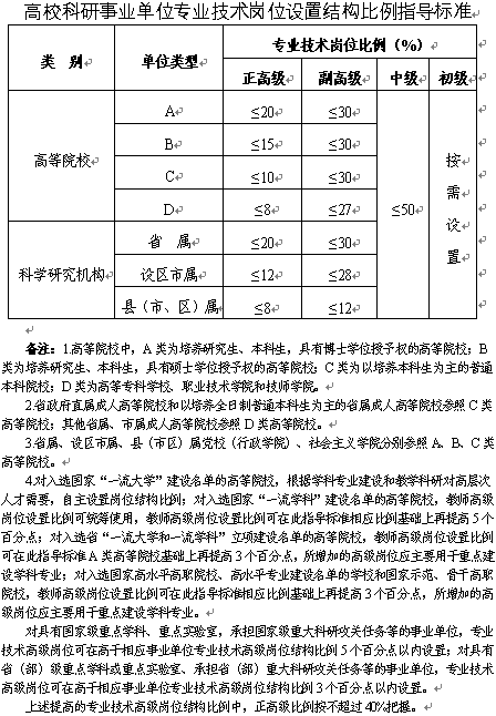 四、赋予各地相应的岗位设置调整权。对各地优势产业、重点项目所属事业单位,以及具有省级及以上重点学科、重点专业或重点实验室、承担国家(省部)重大科研攻关任务等的事业单位,可适当提高高级专业技术岗位设置比例(具体比例见附件);对规模小、人员少、较分散,或专业领域相近、人员交流频繁的事业单位,主管部门可统一制定岗位设置方案,在核准的岗位总量、结构比例和最高等级内统筹设置,集中使用。