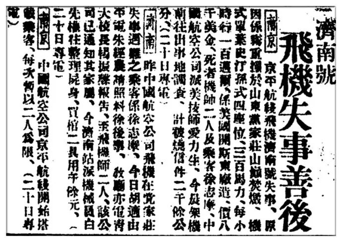 1931年11月19日,徐志摩搭乘中国航空公司的一架“济南号”邮政班机,从南京飞往北平,要去参加当晚林徽因在协和医学院礼堂举行的学术讲座。上午11点35分,飞机飞至济南上空时,遇到大雾。为寻找航线,驾驶员不得不一再降低飞行高度,飞机不幸撞到今天济南市长清区的西大山,机毁人亡。